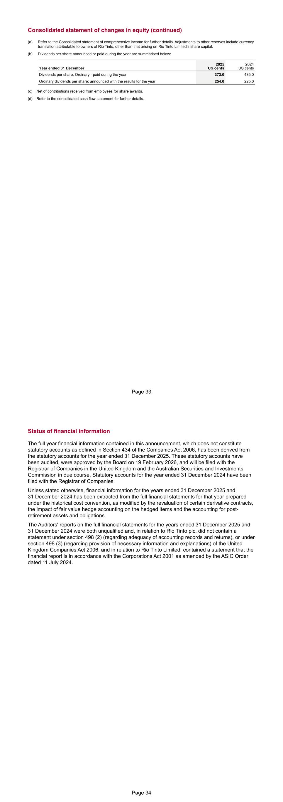 Consolidated statement of changes in equity (continued) (a) Refer to the Consolidated statement of comprehensive income for further details. Adjustments to other reserves include currency translation attributable to owners of Rio Tinto, other than that arising on Rio Tinto Limited’s share capital. (b) Dividends per share announced or paid during the year are summarised below: Year ended 31 December 2025 US cents 2024 US cents Dividends per share: Ordinary - paid during the year 373.0 435.0 Ordinary dividends per share: announced with the results for the year 254.0 225.0 (c) Net of contributions received from employees for share awards. (d) Refer to the consolidated cash flow statement for further details. Page 33 Status of financial information The full year financial information contained in this announcement, which does not constitute statutory accounts as defined in Section 434 of the Companies Act 2006, has been derived from the statutory accounts for the year ended 31 December 2025. These statutory accounts have been audited, were approved by the Board on 19 February 2026, and will be filed with the Registrar of Companies in the United Kingdom and the Australian Securities and Investments Commission in due course. Statutory accounts for the year ended 31 December 2024 have been filed with the Registrar of Companies. Unless stated otherwise, financial information for the years ended 31 December 2025 and 31 December 2024 has been extracted from the full financial statements for that year prepared under the historical cost convention, as modified by the revaluation of certain derivative contracts, the impact of fair value hedge accounting on the hedged items and the accounting for post- retirement assets and obligations. The Auditors' reports on the full financial statements for the years ended 31 December 2025 and 31 December 2024 were both unqualified and, in relation to Rio Tinto plc, did not contain a statement under section 498 (2) (regarding adequacy of accounting records and returns), or under section 498 (3) (regarding provision of necessary information and explanations) of the United Kingdom Companies Act 2006, and in relation to Rio Tinto Limited, contained a statement that the financial report is in accordance with the Corporations Act 2001 as amended by the ASIC Order dated 11 July 2024. Page 34