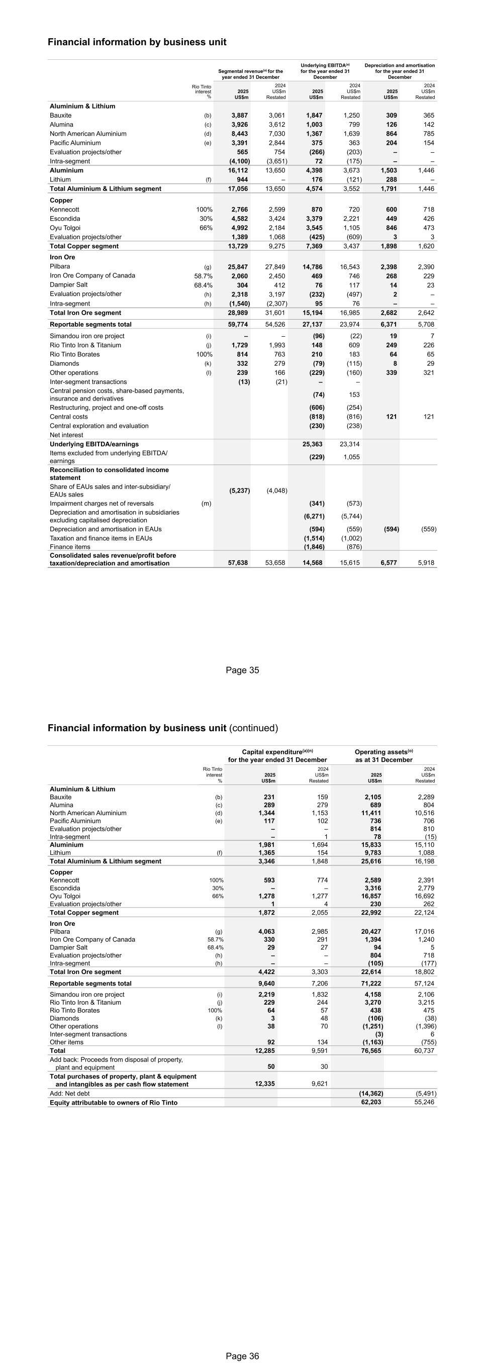 Financial information by business unit Segmental revenue(a) for the year ended 31 December Underlying EBITDA(a) for the year ended 31 December Depreciation and amortisation for the year ended 31 December Rio Tinto interest % 2025 US$m 2024 US$m Restated 2025 US$m 2024 US$m Restated 2025 US$m 2024 US$m Restated Aluminium & Lithium Bauxite (b) 3,887 3,061 1,847 1,250 309 365 Alumina (c) 3,926 3,612 1,003 799 126 142 North American Aluminium (d) 8,443 7,030 1,367 1,639 864 785 Pacific Aluminium (e) 3,391 2,844 375 363 204 154 Evaluation projects/other 565 754 (266) (203) – – Intra-segment (4,100) (3,651) 72 (175) – – Aluminium 16,112 13,650 4,398 3,673 1,503 1,446 Lithium (f) 944 – 176 (121) 288 – Total Aluminium & Lithium segment 17,056 13,650 4,574 3,552 1,791 1,446 Copper Kennecott 100% 2,766 2,599 870 720 600 718 Escondida 30% 4,582 3,424 3,379 2,221 449 426 Oyu Tolgoi 66% 4,992 2,184 3,545 1,105 846 473 Evaluation projects/other 1,389 1,068 (425) (609) 3 3 Total Copper segment 13,729 9,275 7,369 3,437 1,898 1,620 Iron Ore Pilbara (g) 25,847 27,849 14,786 16,543 2,398 2,390 Iron Ore Company of Canada 58.7% 2,060 2,450 469 746 268 229 Dampier Salt 68.4% 304 412 76 117 14 23 Evaluation projects/other (h) 2,318 3,197 (232) (497) 2 – Intra-segment (h) (1,540) (2,307) 95 76 – – Total Iron Ore segment 28,989 31,601 15,194 16,985 2,682 2,642 Reportable segments total 59,774 54,526 27,137 23,974 6,371 5,708 Simandou iron ore project (i) – – (96) (22) 19 7 Rio Tinto Iron & Titanium (j) 1,729 1,993 148 609 249 226 Rio Tinto Borates 100% 814 763 210 183 64 65 Diamonds (k) 332 279 (79) (115) 8 29 Other operations (l) 239 166 (229) (160) 339 321 Inter-segment transactions (13) (21) – – Central pension costs, share-based payments, insurance and derivatives (74) 153 Restructuring, project and one-off costs (606) (254) Central costs (818) (816) 121 121 Central exploration and evaluation (230) (238) Net interest Underlying EBITDA/earnings 25,363 23,314 Items excluded from underlying EBITDA/ earnings (229) 1,055 Reconciliation to consolidated income statement Share of EAUs sales and inter-subsidiary/ EAUs sales (5,237) (4,048) Impairment charges net of reversals (m) (341) (573) Depreciation and amortisation in subsidiaries excluding capitalised depreciation (6,271) (5,744) Depreciation and amortisation in EAUs (594) (559) (594) (559) Taxation and finance items in EAUs (1,514) (1,002) Finance items (1,846) (876) Consolidated sales revenue/profit before taxation/depreciation and amortisation 57,638 53,658 14,568 15,615 6,577 5,918 Page 35 Financial information by business unit (continued) Capital expenditure(a)(n) for the year ended 31 December Operating assets(o) as at 31 December Rio Tinto interest % 2025 US$m 2024 US$m Restated 2025 US$m 2024 US$m Restated Aluminium & Lithium Bauxite (b) 231 159 2,105 2,289 Alumina (c) 289 279 689 804 North American Aluminium (d) 1,344 1,153 11,411 10,516 Pacific Aluminium (e) 117 102 736 706 Evaluation projects/other – – 814 810 Intra-segment – 1 78 (15) Aluminium 1,981 1,694 15,833 15,110 Lithium (f) 1,365 154 9,783 1,088 Total Aluminium & Lithium segment 3,346 1,848 25,616 16,198 Copper Kennecott 100% 593 774 2,589 2,391 Escondida 30% – – 3,316 2,779 Oyu Tolgoi 66% 1,278 1,277 16,857 16,692 Evaluation projects/other 1 4 230 262 Total Copper segment 1,872 2,055 22,992 22,124 Iron Ore Pilbara (g) 4,063 2,985 20,427 17,016 Iron Ore Company of Canada 58.7% 330 291 1,394 1,240 Dampier Salt 68.4% 29 27 94 5 Evaluation projects/other (h) – – 804 718 Intra-segment (h) – – (105) (177) Total Iron Ore segment 4,422 3,303 22,614 18,802 Reportable segments total 9,640 7,206 71,222 57,124 Simandou iron ore project (i) 2,219 1,832 4,158 2,106 Rio Tinto Iron & Titanium (j) 229 244 3,270 3,215 Rio Tinto Borates 100% 64 57 438 475 Diamonds (k) 3 48 (106) (38) Other operations (l) 38 70 (1,251) (1,396) Inter-segment transactions (3) 6 Other items 92 134 (1,163) (755) Total 12,285 9,591 76,565 60,737 Add back: Proceeds from disposal of property, plant and equipment 50 30 Total purchases of property, plant & equipment and intangibles as per cash flow statement 12,335 9,621 Add: Net debt (14,362) (5,491) Equity attributable to owners of Rio Tinto 62,203 55,246 Page 36
