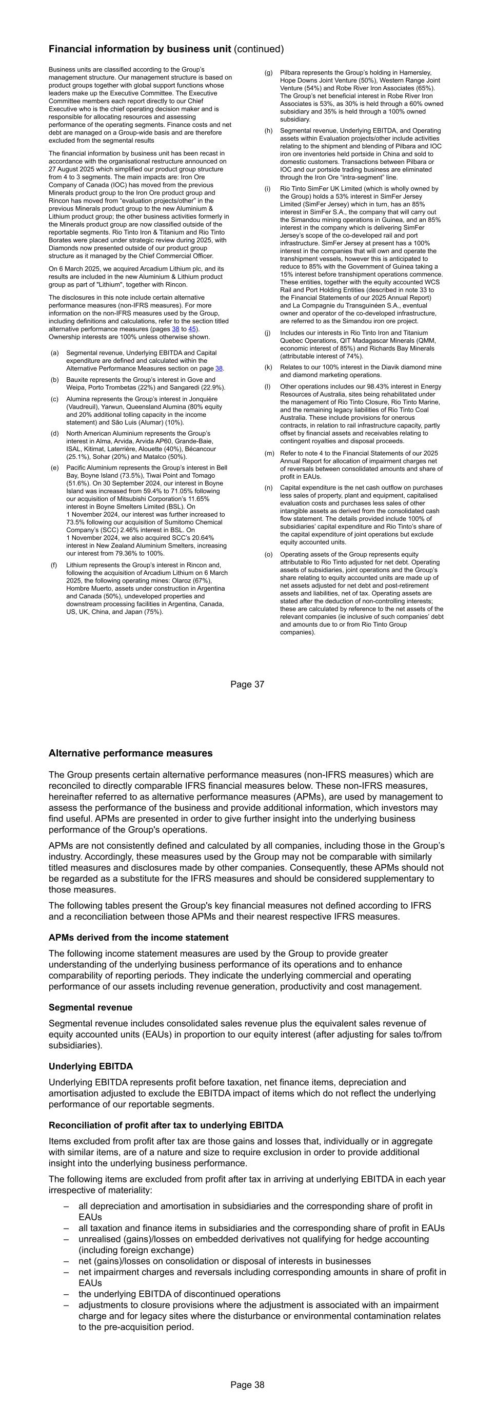 Financial information by business unit (continued) Business units are classified according to the Group’s management structure. Our management structure is based on product groups together with global support functions whose leaders make up the Executive Committee. The Executive Committee members each report directly to our Chief Executive who is the chief operating decision maker and is responsible for allocating resources and assessing performance of the operating segments. Finance costs and net debt are managed on a Group-wide basis and are therefore excluded from the segmental results The financial information by business unit has been recast in accordance with the organisational restructure announced on 27 August 2025 which simplified our product group structure from 4 to 3 segments. The main impacts are: Iron Ore Company of Canada (IOC) has moved from the previous Minerals product group to the Iron Ore product group and Rincon has moved from “evaluation projects/other” in the previous Minerals product group to the new Aluminium & Lithium product group; the other business activities formerly in the Minerals product group are now classified outside of the reportable segments. Rio Tinto Iron & Titanium and Rio Tinto Borates were placed under strategic review during 2025, with Diamonds now presented outside of our product group structure as it managed by the Chief Commercial Officer. On 6 March 2025, we acquired Arcadium Lithium plc, and its results are included in the new Aluminium & Lithium product group as part of "Lithium", together with Rincon. The disclosures in this note include certain alternative performance measures (non-IFRS measures). For more information on the non-IFRS measures used by the Group, including definitions and calculations, refer to the section titled alternative performance measures (pages 38 to 45). Ownership interests are 100% unless otherwise shown. (a) Segmental revenue, Underlying EBITDA and Capital expenditure are defined and calculated within the Alternative Performance Measures section on page 38. (b) Bauxite represents the Group’s interest in Gove and Weipa, Porto Trombetas (22%) and Sangaredi (22.9%). (c) Alumina represents the Group’s interest in Jonquière (Vaudreuil), Yarwun, Queensland Alumina (80% equity and 20% additional tolling capacity in the income statement) and São Luis (Alumar) (10%). (d) North American Aluminium represents the Group’s interest in Alma, Arvida, Arvida AP60, Grande-Baie, ISAL, Kitimat, Laterrière, Alouette (40%), Bécancour (25.1%), Sohar (20%) and Matalco (50%). (e) Pacific Aluminium represents the Group’s interest in Bell Bay, Boyne Island (73.5%), Tiwai Point and Tomago (51.6%). On 30 September 2024, our interest in Boyne Island was increased from 59.4% to 71.05% following our acquisition of Mitsubishi Corporation’s 11.65% interest in Boyne Smelters Limited (BSL). On 1 November 2024, our interest was further increased to 73.5% following our acquisition of Sumitomo Chemical Company’s (SCC) 2.46% interest in BSL. On 1 November 2024, we also acquired SCC’s 20.64% interest in New Zealand Aluminium Smelters, increasing our interest from 79.36% to 100%. (f) Lithium represents the Group’s interest in Rincon and, following the acquisition of Arcadium Lithium on 6 March 2025, the following operating mines: Olaroz (67%), Hombre Muerto, assets under construction in Argentina and Canada (50%), undeveloped properties and downstream processing facilities in Argentina, Canada, US, UK, China, and Japan (75%). (g) Pilbara represents the Group’s holding in Hamersley, Hope Downs Joint Venture (50%), Western Range Joint Venture (54%) and Robe River Iron Associates (65%). The Group’s net beneficial interest in Robe River Iron Associates is 53%, as 30% is held through a 60% owned subsidiary and 35% is held through a 100% owned subsidiary. (h) Segmental revenue, Underlying EBITDA, and Operating assets within Evaluation projects/other include activities relating to the shipment and blending of Pilbara and IOC iron ore inventories held portside in China and sold to domestic customers. Transactions between Pilbara or IOC and our portside trading business are eliminated through the Iron Ore “intra-segment” line. (i) Rio Tinto SimFer UK Limited (which is wholly owned by the Group) holds a 53% interest in SimFer Jersey Limited (SimFer Jersey) which in turn, has an 85% interest in SimFer S.A., the company that will carry out the Simandou mining operations in Guinea, and an 85% interest in the company which is delivering SimFer Jersey’s scope of the co-developed rail and port infrastructure. SimFer Jersey at present has a 100% interest in the companies that will own and operate the transhipment vessels, however this is anticipated to reduce to 85% with the Government of Guinea taking a 15% interest before transhipment operations commence. These entities, together with the equity accounted WCS Rail and Port Holding Entities (described in note 33 to the Financial Statements of our 2025 Annual Report) and La Compagnie du Transguinéen S.A., eventual owner and operator of the co-developed infrastructure, are referred to as the Simandou iron ore project. (j) Includes our interests in Rio Tinto Iron and Titanium Quebec Operations, QIT Madagascar Minerals (QMM, economic interest of 85%) and Richards Bay Minerals (attributable interest of 74%). (k) Relates to our 100% interest in the Diavik diamond mine and diamond marketing operations. (l) Other operations includes our 98.43% interest in Energy Resources of Australia, sites being rehabilitated under the management of Rio Tinto Closure, Rio Tinto Marine, and the remaining legacy liabilities of Rio Tinto Coal Australia. These include provisions for onerous contracts, in relation to rail infrastructure capacity, partly offset by financial assets and receivables relating to contingent royalties and disposal proceeds. (m) Refer to note 4 to the Financial Statements of our 2025