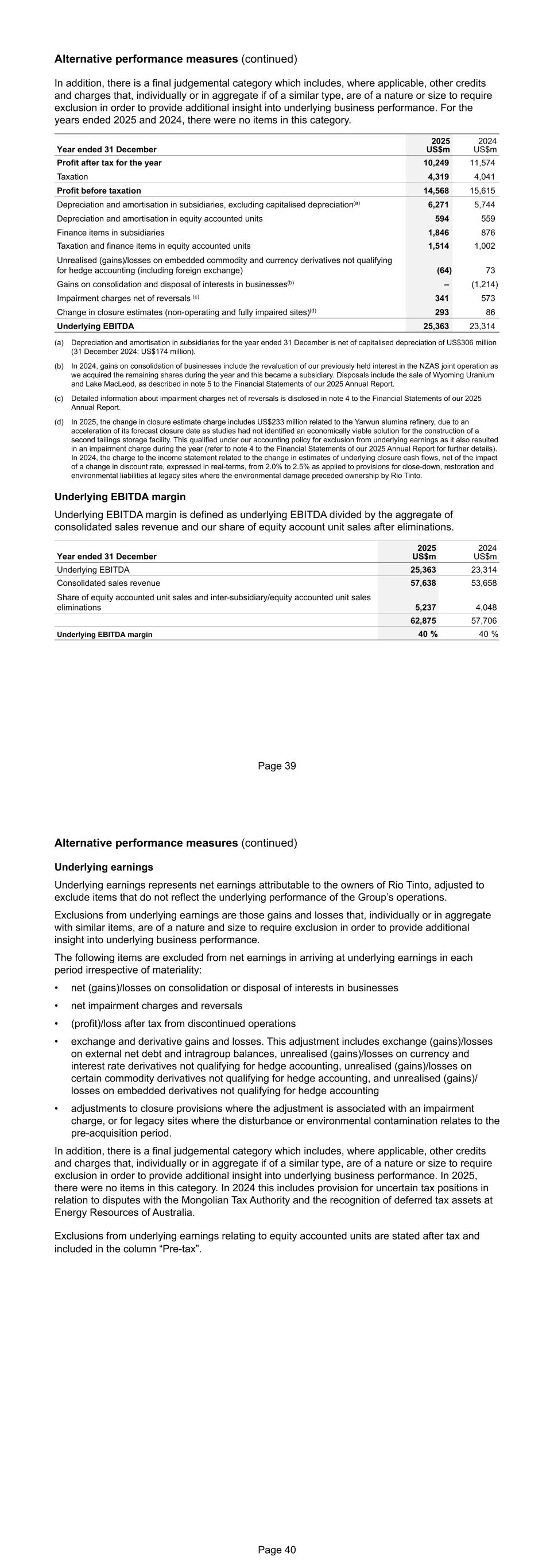 Alternative performance measures (continued) In addition, there is a final judgemental category which includes, where applicable, other credits and charges that, individually or in aggregate if of a similar type, are of a nature or size to require exclusion in order to provide additional insight into underlying business performance. For the years ended 2025 and 2024, there were no items in this category. Year ended 31 December 2025 US$m 2024 US$m Profit after tax for the year 10,249 11,574 Taxation 4,319 4,041 Profit before taxation 14,568 15,615 Depreciation and amortisation in subsidiaries, excluding capitalised depreciation(a) 6,271 5,744 Depreciation and amortisation in equity accounted units 594 559 Finance items in subsidiaries 1,846 876 Taxation and finance items in equity accounted units 1,514 1,002 Unrealised (gains)/losses on embedded commodity and currency derivatives not qualifying for hedge accounting (including foreign exchange) (64) 73 Gains on consolidation and disposal of interests in businesses(b) – (1,214) Impairment charges net of reversals (c) 341 573 Change in closure estimates (non-operating and fully impaired sites)(d) 293 86 Underlying EBITDA 25,363 23,314 (a) Depreciation and amortisation in subsidiaries for the year ended 31 December is net of capitalised depreciation of US$306 million (31 December 2024: US$174 million). (b) In 2024, gains on consolidation of businesses include the revaluation of our previously held interest in the NZAS joint operation as we acquired the remaining shares during the year and this became a subsidiary. Disposals include the sale of Wyoming Uranium and Lake MacLeod, as described in note 5 to the Financial Statements of our 2025 Annual Report. (c) Detailed information about impairment charges net of reversals is disclosed in note 4 to the Financial Statements of our 2025 Annual Report. (d) In 2025, the change in closure estimate charge includes US$233 million related to the Yarwun alumina refinery, due to an acceleration of its forecast closure date as studies had not identified an economically viable solution for the construction of a second tailings storage facility. This qualified under our accounting policy for exclusion from underlying earnings as it also resulted in an impairment charge during the year (refer to note 4 to the Financial Statements of our 2025 Annual Report for further details). In 2024, the charge to the income statement related to the change in estimates of underlying closure cash flows, net of the impact of a change in discount rate, expressed in real-terms, from 2.0% to 2.5% as applied to provisions for close-down, restoration and environmental liabilities at legacy sites where the environmental damage preceded ownership by Rio Tinto. Underlying EBITDA margin Underlying EBITDA margin is defined as underlying EBITDA divided by the aggregate of consolidated sales revenue and our share of equity account unit sales after eliminations. Year ended 31 December 2025 US$m 2024 US$m Underlying EBITDA 25,363 23,314 Consolidated sales revenue 57,638 53,658 Share of equity accounted unit sales and inter-subsidiary/equity accounted unit sales eliminations 5,237 4,048 62,875 57,706 Underlying EBITDA margin 40 % 40 % Page 39 Alternative performance measures (continued) Underlying earnings Underlying earnings represents net earnings attributable to the owners of Rio Tinto, adjusted to exclude items that do not reflect the underlying performance of the Group’s operations. Exclusions from underlying earnings are those gains and losses that, individually or in aggregate with similar items, are of a nature and size to require exclusion in order to provide additional insight into underlying business performance. The following items are excluded from net earnings in arriving at underlying earnings in each period irrespective of materiality: • net (gains)/losses on consolidation or disposal of interests in businesses • net impairment charges and reversals • (profit)/loss after tax from discontinued operations • exchange and derivative gains and losses. This adjustment includes exchange (gains)/losses on external net debt and intragroup balances, unrealised (gains)/losses on currency and interest rate derivatives not qualifying for hedge accounting, unrealised (gains)/losses on certain commodity derivatives not qualifying for hedge accounting, and unrealised (gains)/ losses on embedded derivatives not qualifying for hedge accounting • adjustments to closure provisions where the adjustment is associated with an impairment charge, or for legacy sites where the disturbance or environmental contamination relates to the pre-acquisition period. In addition, there is a final judgemental category which includes, where applicable, other credits and charges that, individually or in aggregate if of a similar type, are of a nature or size to require exclusion in order to provide additional insight into underlying business performance. In 2025, there were no items in this category. In 2024 this includes provision for uncertain tax positions in relation to disputes with the Mongolian Tax Authority and the recognition of deferred tax assets at Energy Resources of Australia. Exclusions from underlying earnings relating to equity accounted units are stated after tax and included in the column “Pre-tax”. Page 40