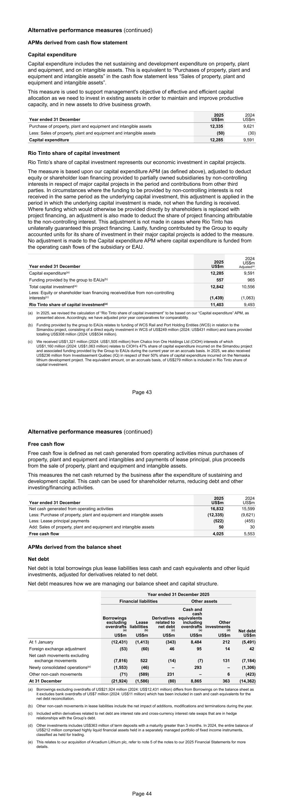 Alternative performance measures (continued) APMs derived from cash flow statement Capital expenditure Capital expenditure includes the net sustaining and development expenditure on property, plant and equipment, and on intangible assets. This is equivalent to “Purchases of property, plant and equipment and intangible assets” in the cash flow statement less “Sales of property, plant and equipment and intangible assets”. This measure is used to support management's objective of effective and efficient capital allocation as we need to invest in existing assets in order to maintain and improve productive capacity, and in new assets to drive business growth. Year ended 31 December 2025 US$m 2024 US$m Purchase of property, plant and equipment and intangible assets 12,335 9,621 Less: Sales of property, plant and equipment and intangible assets (50) (30) Capital expenditure 12,285 9,591 Rio Tinto share of capital investment Rio Tinto’s share of capital investment represents our economic investment in capital projects. The measure is based upon our capital expenditure APM (as defined above), adjusted to deduct equity or shareholder loan financing provided to partially owned subsidiaries by non-controlling interests in respect of major capital projects in the period and contributions from other third parties. In circumstances where the funding to be provided by non-controlling interests is not received in the same period as the underlying capital investment, this adjustment is applied in the period in which the underlying capital investment is made, not when the funding is received. Where funding which would otherwise be provided directly by shareholders is replaced with project financing, an adjustment is also made to deduct the share of project financing attributable to the non-controlling interest. This adjustment is not made in cases where Rio Tinto has unilaterally guaranteed this project financing. Lastly, funding contributed by the Group to equity accounted units for its share of investment in their major capital projects is added to the measure. No adjustment is made to the Capital expenditure APM where capital expenditure is funded from the operating cash flows of the subsidiary or EAU. Year ended 31 December 2025 US$m 2024 US$m Adjusted(a) Capital expenditure(a) 12,285 9,591 Funding provided by the group to EAUs(b) 557 965 Total capital investment(a) 12,842 10,556 Less: Equity or shareholder loan financing received/due from non-controlling interests(c) (1,439) (1,063) Rio Tinto share of capital investment(a) 11,403 9,493 (a) In 2025, we revised the calculation of “Rio Tinto share of capital investment” to be based on our “Capital expenditure” APM, as presented above. Accordingly, we have adjusted prior year comparatives for comparability. (b) Funding provided by the group to EAUs relates to funding of WCS Rail and Port Holding Entities (WCS) in relation to the Simandou project, consisting of a direct equity investment in WCS of US$249 million (2024: US$431 million) and loans provided totalling US$308 million (2024: US$534 million). (c) We received US$1,321 million (2024: US$1,505 million) from Chalco Iron Ore Holdings Ltd (CIOH) interests of which US$1,160 million (2024: US$1,063 million) relates to CIOH’s 47% share of capital expenditure incurred on the Simandou project and associated funding provided by the Group to EAUs during the current year on an accruals basis. In 2025, we also received US$236 million from Investissement Québec (IQ) in respect of their 50% share of capital expenditure incurred on the Nemaska lithium development project. The equivalent amount, on an accruals basis, of US$279 million is included in Rio Tinto share of capital investment. Page 43 Alternative performance measures (continued) Free cash flow Free cash flow is defined as net cash generated from operating activities minus purchases of property, plant and equipment and intangibles and payments of lease principal, plus proceeds from the sale of property, plant and equipment and intangible assets. This measures the net cash returned by the business after the expenditure of sustaining and development capital. This cash can be used for shareholder returns, reducing debt and other investing/financing activities. Year ended 31 December 2025 US$m 2024 US$m Net cash generated from operating activities 16,832 15,599 Less: Purchase of property, plant and equipment and intangible assets (12,335) (9,621) Less: Lease principal payments (522) (455) Add: Sales of property, plant and equipment and intangible assets 50 30 Free cash flow 4,025 5,553 APMs derived from the balance sheet Net debt Net debt is total borrowings plus lease liabilities less cash and cash equivalents and other liquid investments, adjusted for derivatives related to net debt. Net debt measures how we are managing our balance sheet and capital structure. Year ended 31 December 2025 Financial liabilities Other assets Borrowings excluding overdrafts (a) US$m Lease liabilities (b) US$m Derivatives related to net debt (c) US$m Cash and cash equivalents including overdrafts (a) US$m Other investments (d) US$m Net debt US$m At 1 January (12,431) (1,413) (343) 8,484 212 (5,491) Foreign exchange adjustment (53) (60) 46 95 14 42 Net cash movements excluding exchange movements (7,816) 522 (14) (7) 131 (7,184) Newly consolidated operations(e) (1,553) (46) – 293 – (1,306) Other non-cash movements (71) (589) 231 – 6 (423) At 31 December (21,924) (1,586) (80) 8,865 363 (14,362) (a) Borrowings excluding overdrafts of US$21,924 million (2024: US$12,431 million) differs from Borrowings on the balance sheet as it excludes bank overdrafts of US$7 million (2024: US$11 million) which has been included in cash and cash equivalents for the net debt reconciliation. (b) Other non-cash movements in lease liabilities include the net impact of additions, modifications and terminations during the year. (c) Included within derivatives related to net debt