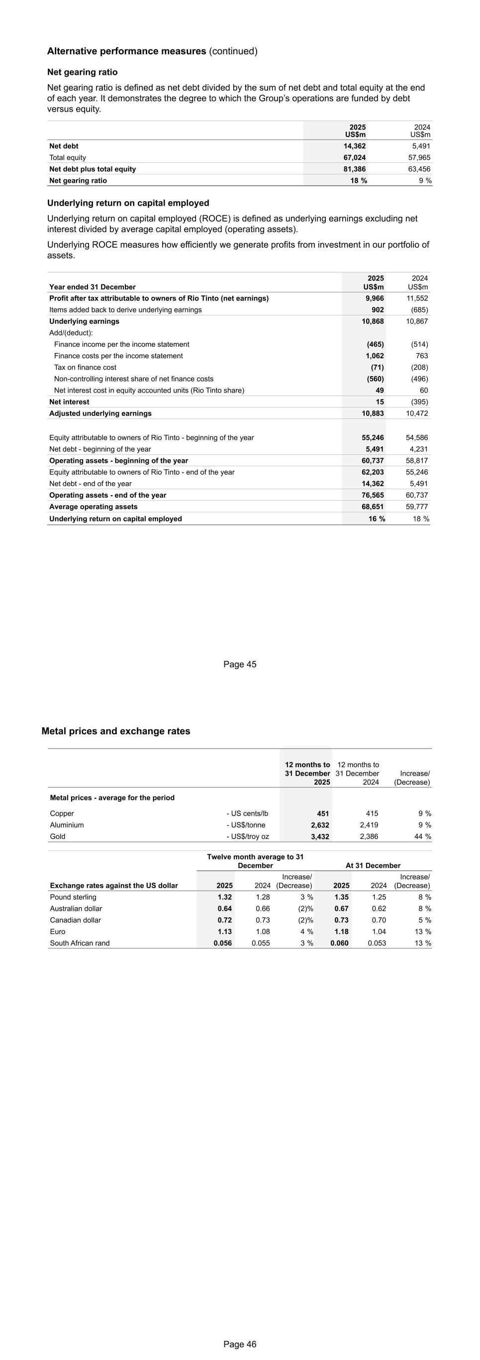 Alternative performance measures (continued) Net gearing ratio Net gearing ratio is defined as net debt divided by the sum of net debt and total equity at the end of each year. It demonstrates the degree to which the Group’s operations are funded by debt versus equity. 2025 US$m 2024 US$m Net debt 14,362 5,491 Total equity 67,024 57,965 Net debt plus total equity 81,386 63,456 Net gearing ratio 18 % 9 % Underlying return on capital employed Underlying return on capital employed (ROCE) is defined as underlying earnings excluding net interest divided by average capital employed (operating assets). Underlying ROCE measures how efficiently we generate profits from investment in our portfolio of assets. Year ended 31 December 2025 US$m 2024 US$m Profit after tax attributable to owners of Rio Tinto (net earnings) 9,966 11,552 Items added back to derive underlying earnings 902 (685) Underlying earnings 10,868 10,867 Add/(deduct): Finance income per the income statement (465) (514) Finance costs per the income statement 1,062 763 Tax on finance cost (71) (208) Non-controlling interest share of net finance costs (560) (496) Net interest cost in equity accounted units (Rio Tinto share) 49 60 Net interest 15 (395) Adjusted underlying earnings 10,883 10,472 Equity attributable to owners of Rio Tinto - beginning of the year 55,246 54,586 Net debt - beginning of the year 5,491 4,231 Operating assets - beginning of the year 60,737 58,817 Equity attributable to owners of Rio Tinto - end of the year 62,203 55,246 Net debt - end of the year 14,362 5,491 Operating assets - end of the year 76,565 60,737 Average operating assets 68,651 59,777 Underlying return on capital employed 16 % 18 % Page 45 Metal prices and exchange rates 12 months to 31 December 2025 12 months to 31 December 2024 Increase/ (Decrease) Metal prices - average for the period Copper - US cents/lb 451 415 9 % Aluminium - US$/tonne 2,632 2,419 9 % Gold - US$/troy oz 3,432 2,386 44 % Twelve month average to 31 December At 31 December Exchange rates against the US dollar 2025 2024 Increase/ (Decrease) 2025 2024 Increase/ (Decrease) Pound sterling 1.32 1.28 3 % 1.35 1.25 8 % Australian dollar 0.64 0.66 (2) % 0.67 0.62 8 % Canadian dollar 0.72 0.73 (2) % 0.73 0.70 5 % Euro 1.13 1.08 4 % 1.18 1.04 13 % South African rand 0.056 0.055 3 % 0.060 0.053 13 % Page 46
