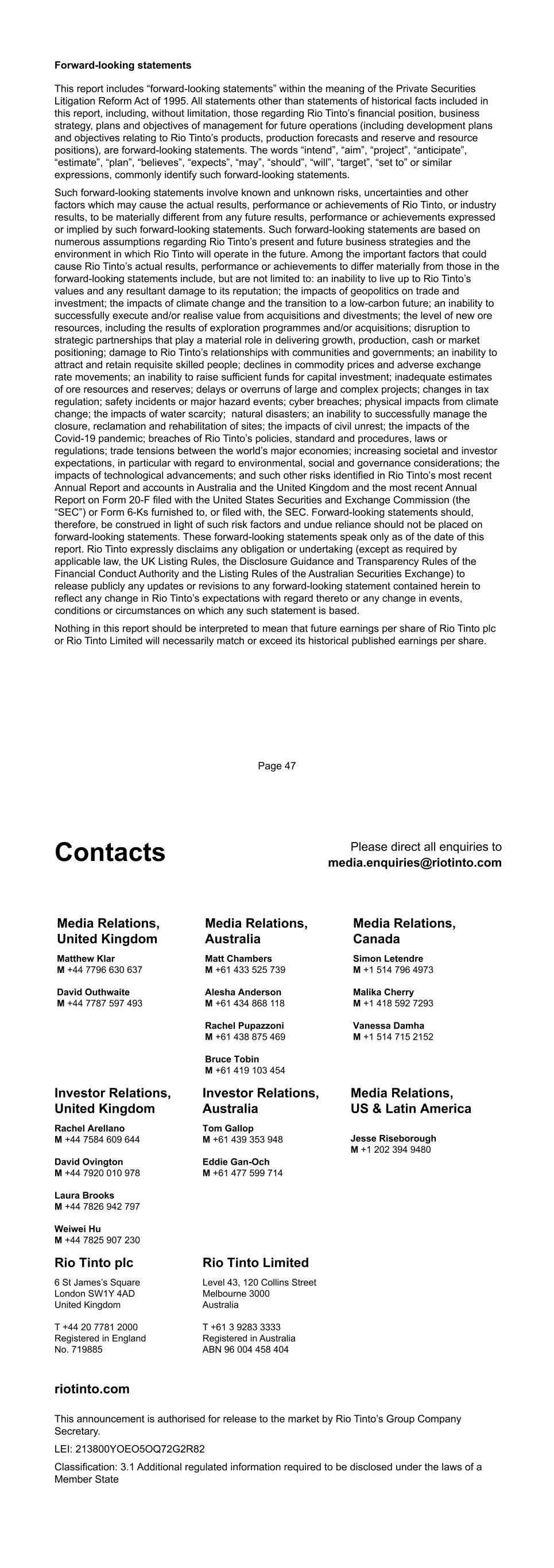 Forward-looking statements This report includes “forward-looking statements” within the meaning of the Private Securities Litigation Reform Act of 1995. All statements other than statements of historical facts included in this report, including, without limitation, those regarding Rio Tinto’s financial position, business strategy, plans and objectives of management for future operations (including development plans and objectives relating to Rio Tinto’s products, production forecasts and reserve and resource positions), are forward-looking statements. The words “intend”, “aim”, “project”, “anticipate”, “estimate”, “plan”, “believes”, “expects”, “may”, “should”, “will”, “target”, “set to” or similar expressions, commonly identify such forward-looking statements. Such forward-looking statements involve known and unknown risks, uncertainties and other factors which may cause the actual results, performance or achievements of Rio Tinto, or industry results, to be materially different from any future results, performance or achievements expressed or implied by such forward-looking statements. Such forward-looking statements are based on numerous assumptions regarding Rio Tinto’s present and future business strategies and the environment in which Rio Tinto will operate in the future. Among the important factors that could cause Rio Tinto’s actual results, performance or achievements to differ materially from those in the forward-looking statements include, but are not limited to: an inability to live up to Rio Tinto’s values and any resultant damage to its reputation; the impacts of geopolitics on trade and investment; the impacts of climate change and the transition to a low-carbon future; an inability to successfully execute and/or realise value from acquisitions and divestments; the level of new ore resources, including the results of exploration programmes and/or acquisitions; disruption to strategic partnerships that play a material role in delivering growth, production, cash or market positioning; damage to Rio Tinto’s relationships with communities and governments; an inability to attract and retain requisite skilled people; declines in commodity prices and adverse exchange rate movements; an inability to raise sufficient funds for capital investment; inadequate estimates of ore resources and reserves; delays or overruns of large and complex projects; changes in tax regulation; safety incidents or major hazard events; cyber breaches; physical impacts from climate change; the impacts of water scarcity; natural disasters; an inability to successfully manage the closure, reclamation and rehabilitation of sites; the impacts of civil unrest; the impacts of the Covid-19 pandemic; breaches of Rio Tinto’s policies, standard and procedures, laws or regulations; trade tensions between the world’s major economies; increasing societal and investor expectations, in particular with regard to environmental, social and governance considerations; the impacts of technological advancements; and such other risks identified in Rio Tinto’s most recent Annual Report and accounts in Australia and the United Kingdom and the most recent Annual Report on Form 20-F filed with the United States Securities and Exchange Commission (the “SEC”) or Form 6-Ks furnished to, or filed with, the SEC. Forward-looking statements should, therefore, be construed in light of such risk factors and undue reliance should not be placed on forward-looking statements. These forward-looking statements speak only as of the date of this report. Rio Tinto expressly disclaims any obligation or undertaking (except as required by applicable law, the UK Listing Rules, the Disclosure Guidance and Transparency Rules of the Financial Conduct Authority and the Listing Rules of the Australian Securities Exchange) to release publicly any updates or revisions to any forward-looking statement contained herein to reflect any change in Rio Tinto’s expectations with regard thereto or any change in events, conditions or circumstances on which any such statement is based. Nothing in this report should be interpreted to mean that future earnings per share of Rio Tinto plc or Rio Tinto Limited will necessarily match or exceed its historical published earnings per share. Page 47 Contacts Please direct all enquiries to media.enquiries@riotinto.com Media Relations, United Kingdom Matthew Klar M +44 7796 630 637 David Outhwaite M +44 7787 597 493 Media Relations, Australia Matt Chambers M +61 433 525 739 Alesha Anderson M +61 434 868 118 Rachel Pupazzoni M +61 438 875 469 Bruce Tobin M +61 419 103 454 Media Relations, Canada Simon Letendre M +1 514 796 4973 Malika Cherry M +1 418 592 7293 Vanessa Damha M +1 514 715 2152 Investor Relations, United Kingdom Rachel Arellano M +44 7584 609 644 David Ovington M +44 7920 010 978 Laura Brooks M +44 7826 942 797 Weiwei Hu M +44 7825 907 230 Investor Relations, Australia Tom Gallop M +61 439 353 948 Eddie Gan-Och M +61 477 599 714 Media Relations, US & Latin America Jesse Riseborough M +1 202 394 9480 Rio Tinto plc 6 St James’s Square London SW1Y 4AD United Kingdom T +44 20 7781 2000 Registered in England No. 719885 Rio Tinto Limited Level 43, 120 Collins Street Melbourne 3000 Australia T +61 3 9283 3333 Registered in Australia ABN 96 004 458 404 riotinto.com This announcement is authorised for release to the market by Rio Tinto’s Group Company Secretary. LEI: 213800YOEO5OQ72G2R82 Classification: 3.1 Additional regulated information required to be disclosed under the laws of a Member State