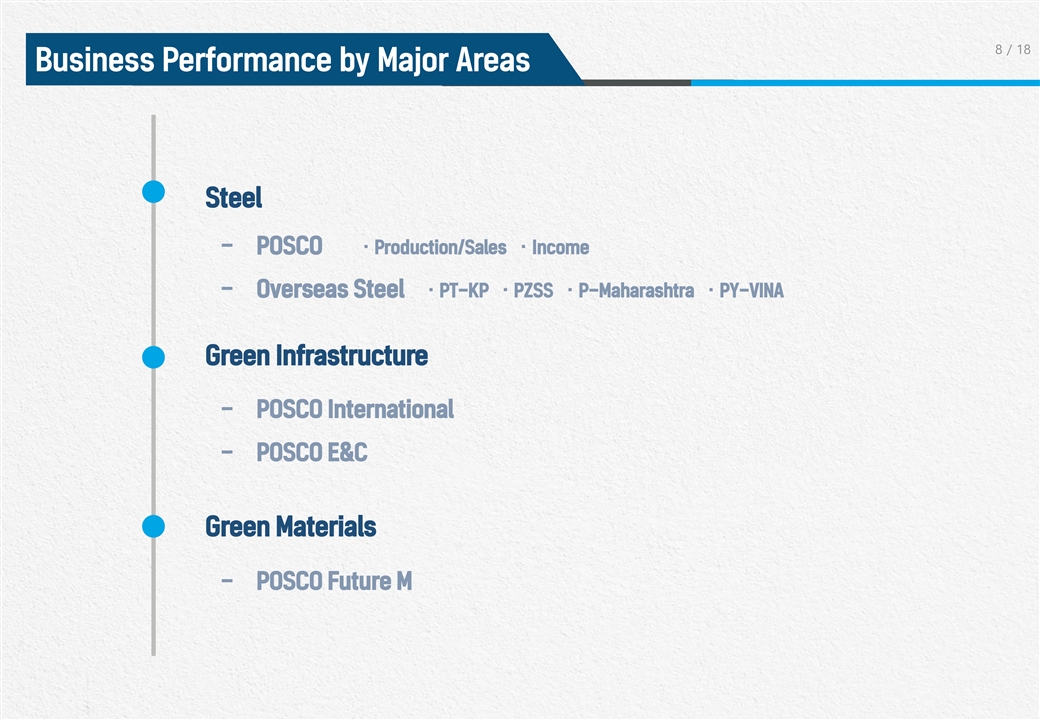 8 / 18 Business Performance by Major Areas Steel - POSCO · Production/Sales · Income - Overseas Steel · PT-KP · PZSS · P-Maharashtra · PY-VINA Green Infrastructure - POSCO International - POSCO E&C Green Materials - POSCO Future M