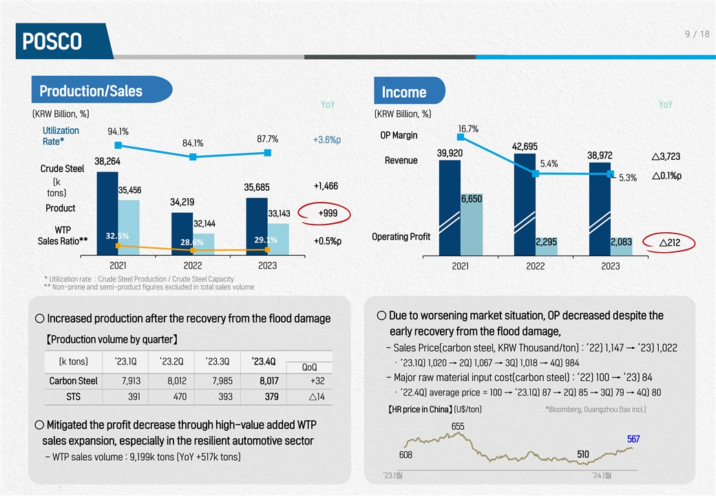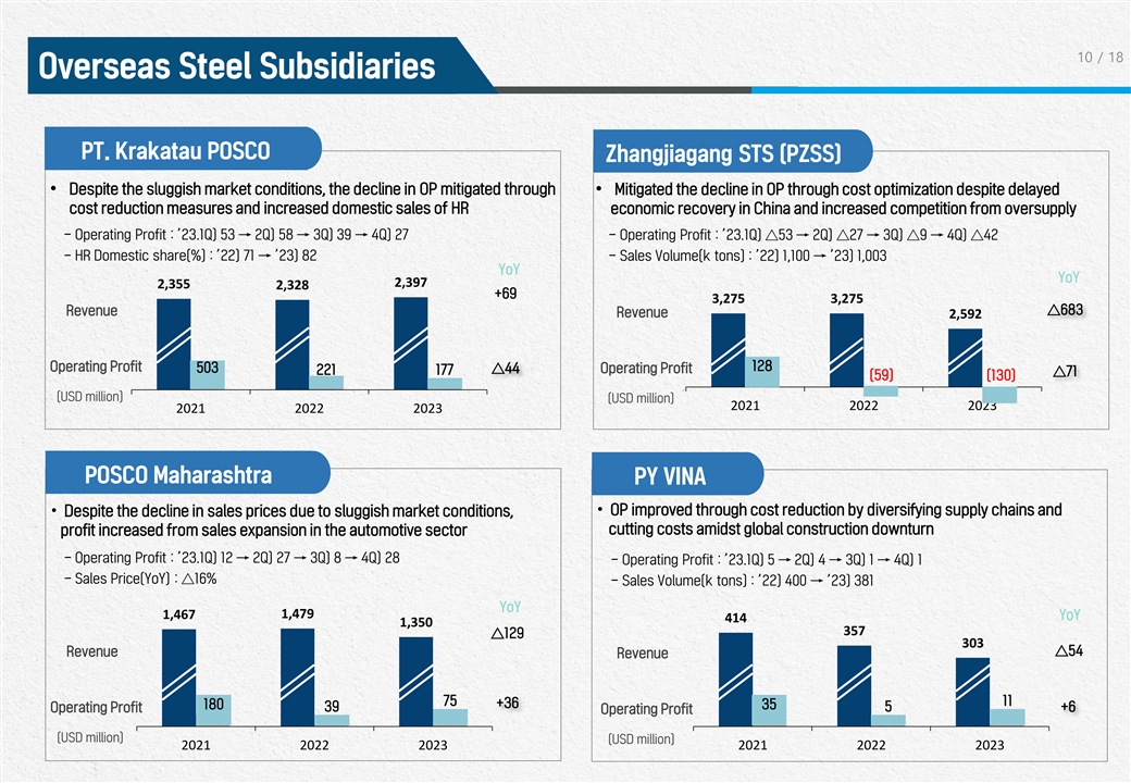 9 / 18 POSCO Production/Sales Income YoY YoY (KRW Billion, %) (KRW Billion, %) 16.7% Utilization 94.1% 50, 000 OP Margin 87.7% +3.6%p 15. 0% Rate* 84.1% 45, 000 42,695 90. 00% 40, 000 39,920 38,972 10. 0% △3,723 40, 000 80. 00% Revenue 38,264 5.4% Crude Steel 35, 000 70. 00% 38, 000 5.0 % 90% △0.1%p 5.3% 40, 000 (k 30, 000 60. 00% +1,466 35,685 80% 0.0 % 35,456 tons) 36, 000 25, 000 50. 00% 70% 6,650 38, 000 34,219 -5.0% 20, 000 40. 00% Product 60% 34, 000 33,143 +999 30. 00% 15, 000 36, 000 -10.0% 32,144 50% 20. 00% 10, 000 WTP 32, 000 40% 32.5% Operating Profit -15.0% 29.1% Sales Ratio** 34, 000 10. 00% +0.5%p 5,0 00 28.6% 2,295 2,083 △212 30% 30, 000 0.0 0% 0 -20.0% 20% 32, 000 2021 2022 2023 2021 2022 2023 10% * Utilization rate : Crude Steel Production / Crude Steel Capacity 30, 000 0% ** Non-prime and semi-product figures excluded in total sales volume ○ Due to worsening market situation, OP decreased despite the ○ Increased production after the recovery from the flood damage early recovery from the flood damage, 【Production volume by quarter】 - Sales Price(carbon steel, KRW Thousand/ton) : ’22) 1,147 → ’23) 1,022 (k tons) ‘23.1Q ’23.2Q ’23.3Q ‘23.4Q · ’23.1Q) 1,020 → 2Q) 1,067 → 3Q) 1,018 → 4Q) 984 QoQ - Major raw material input cost(carbon steel) : ’22) 100 → ’23) 84 Carbon Steel 7,913 8,012 7,985 8,017 +32 · ’22.4Q) average price = 100 → ’23.1Q) 87 → 2Q) 85 → 3Q) 79 → 4Q) 80 STS 391 470 393 379 △14 *Bloomberg, Guangzhou (tax incl.) 【HR price in China】 (U$/ton) ○ Mitigated the profit decrease through high-value added WTP 655 567 sales expansion, especially in the resilient automotive sector 608 510 - WTP sales volume : 9,199k tons (YoY +517k tons) ‘23.1월 ‘24.1월