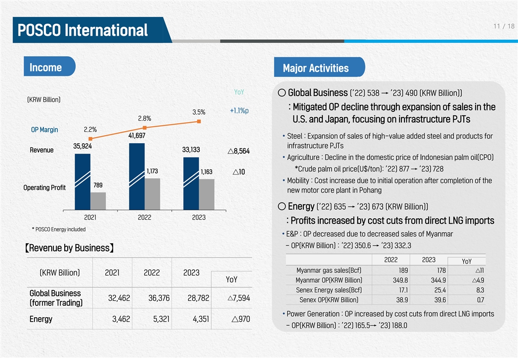 11 / 18 POSCO International Income Major Activities YoY ○ Global Business (’22) 538 → ’23) 490 (KRW Billion)) (KRW Billion) : Mitigated OP decline through expansion of sales in the +1.1%p 3.5% 60. 00% 2.8% U.S. and Japan, focusing on infrastructure PJTs 13, 500 50. 00% OP Margin 2.2% 41,697 • Steel : Expansion of sales of high-value added steel and products for 11, 500 40. 00% infrastructure PJTs 35,924 33,133 Revenue △8,564 9,5 00 • Agriculture : Decline in the domestic price of Indonesian palm oil(CPO) 30. 00% 7,5 00 *Crude palm oil price(U$/ton): ’22) 877 → ’23) 728 1,173 1,163 △10 20. 00% 5,5 00 • Mobility : Cost increase due to initial operation after completion of the 789 Operating Profit new motor core plant in Pohang 10. 00% 3,5 00 ○ Energy (’22) 635 → ’23) 673 (KRW Billion)) 1,5 00 0.0 0% 2021 2022 2023 : Profits increased by cost cuts from direct LNG imports * POSCO Energy included • E&P : OP decreased due to decreased sales of Myanmar - OP(KRW Billion) : ‘22) 350.6 → ‘23) 332.3 【Revenue by Business】 2022 2023 YoY Myanmar gas sales(Bcf) 189 178 △11 (KRW Billion) 2021 2022 2023 △ YoY Myanmar OP(KRW Billion) 349.8 344.9 4.9 Senex Energy sales(Bcf) 17.1 25.4 8.3 Global Business △ 32,462 36,376 28,782 7,594 Senex OP(KRW Billion) 38.9 39.6 0.7 (former Trading) • Power Generation : OP increased by cost cuts from direct LNG imports Energy 3,462 5,321 4,351 △970 - OP(KRW Billion) : ’22) 165.5→ ‘23) 188.0