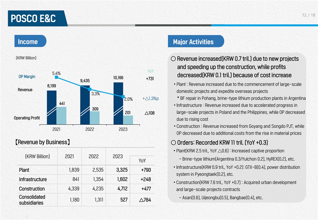 12 / 18 POSCO E&C Income Major Activities (KRW Billion) ○ Revenue increased(KRW 0.7 tril.) due to new projects 13, 800 7.0 0% and speeding up the construction, while profits YoY 5.4% 11, 800 decreased(KRW 0.1 tril.) because of cost increase OP Margin 10,166 5.0 0% +731 9,435 9,8 00 • Plant : Revenue increased due to the commencement of large-scale 8,199 Revenue 3.0 0% 7,8 00 domestic projects and expedite overseas projects 3.3% +△1.3%p * BF repair in Pohang, brine-type lithium production plants in Argentina 5,8 00 2.0% 1.0 0% 441 • Infrastructure : Revenue increased due to accelerated progress in 3,8 00 309 large-scale projects in Poland and the Philippines, while OP decreased 201 -1.00% △108 1,8 00 Operating Profit due to rising cost -200 -3.00% • Construction : Revenue increased from Goyang and Songdo PJT, while 2021 2022 2023 OP decreased due to additional costs from the rise in material prices 【Revenue by Business】 ○ Orders: Recorded KRW 11 tril. (YoY +0.3) • Plant(KRW 2.5 tril., YoY △0.6) : Increased captive proportion (KRW Billion) 2021 2022 2023 - Brine-type lithium(Argentina 0.3/Yulchon 0.2), HyREX(0.2), etc. YoY • Infrastructure(KRW 0.9 tril., YoY +0.2): GTX-B(0.4), power distribution Plant 1,839 2,535 3,325 +790 system in Pyeongtaek(0.2), etc. Infrastructure 841 1,354 1,602 +248 • Construction(KRW 7.6 tril., YoY +0.7) : Acquired urban development Construction 4,339 4,235 4,712 +477 and large-scale projects contracts Consolidated - Asan(0.6), Uijeongbu(0.5), Bangbae(0.4), etc. 1,180 1,311 527 △784 subsidiaries
