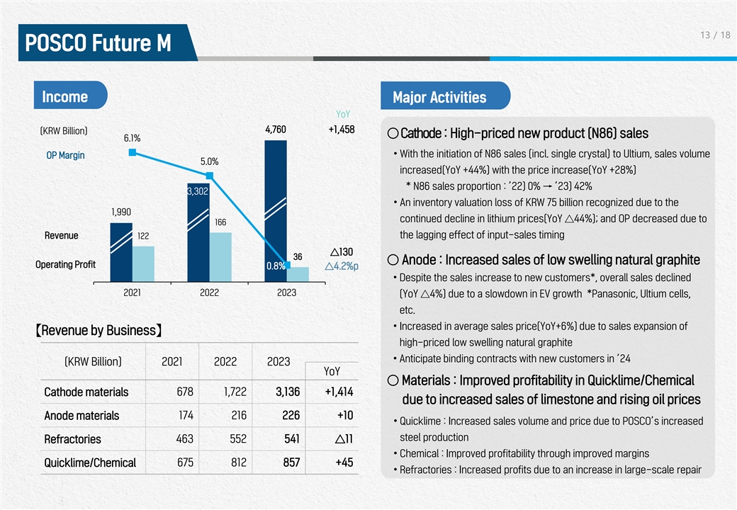 13 / 18 POSCO Future M Income Major Activities YoY 4,760 +1,458 (KRW Billion) 5,0 00 7.0 0% ○ Cathode : High-priced new product (N86) sales 6.1% 4,5 00 6.0 0% • With the initiation of N86 sales (incl. single crystal) to Ultium, sales volume OP Margin 4,0 00 5.0% increased(YoY +44%) with the price increase(YoY +28%) 5.0 0% 3,5 00 * N86 sales proportion : ’22) 0% → ’23) 42% 3,0 00 3,302 4.0 0% • An inventory valuation loss of KRW 75 billion recognized due to the 2,5 00 1,990 3.0 0% continued decline in lithium prices(YoY △44%); and OP decreased due to 2,0 00 166 1,5 00 the lagging effect of input-sales timing Revenue 122 2.0 0% 1,0 00 △130 36 1.0 0% ○ Anode : Increased sales of low swelling natural graphite Operating Profi 500t 0.8% △4.2%p • Despite the sales increase to new customers*, overall sales declined 0 0.0 0% 2021 2022 2023 (YoY △4%) due to a slowdown in EV growth *Panasonic, Ultium cells, etc. • Increased in average sales price(YoY+6%) due to sales expansion of 【Revenue by Business】 high-priced low swelling natural graphite • Anticipate binding contracts with new customers in ’24 (KRW Billion) 2021 2022 2023 YoY ○ Materials : Improved profitability in Quicklime/Chemical Cathode materials 678 1,722 3,136 +1,414 due to increased sales of limestone and rising oil prices Anode materials 174 216 226 +10 • Quicklime : Increased sales volume and price due to POSCO’s increased steel production Refractories 463 552 541 △11 • Chemical : Improved profitability through improved margins Quicklime/Chemical 675 812 857 +45 • Refractories : Increased profits due to an increase in large-scale repair