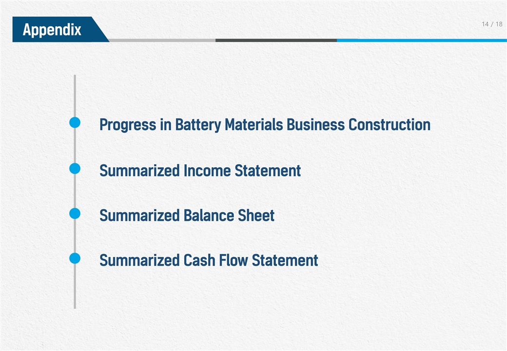 14 / 18 Appendix Progress in Battery Materials Business Construction Summarized Income Statement Summarized Balance Sheet Summarized Cash Flow Statement
