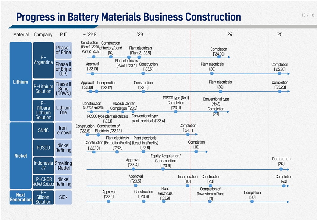 15 / 18 Progress in Battery Materials Business Construction Material Cpmpany PJT ~ '22.E '23. '24 '25 Construction Construction (Plant 1. ’22.10, Phase I of factory/pond Plant electricals Completion Plant 2. ’22.12) of Brine (1Q) (Plant 2. ’23.5) (’24.2Q) P- Plant electricals Argentina Approval Construction Plant electricals Completion Phase II (Plant 1. ’23.4) (‘22.10) of Brine (’23.6.) (2Q) (‘25.2Q) (UP) Lithium Plant electricals Approval Incorporation Construction Completion Phase II P-Lithium (2Q) (‘22.10) (’22.12) (’23..6) (‘25.2Q) Brine Solution (DOWN) POSCO type (No.1) Conventional type Completion P- Construction HQ/Sub Center (No.2) (No. 2‘22.8, No.1‘22.11) (’23.11) Lithium Pilbara Completion (‘23.3) Completion Lithium Ore (2Q) Conventional type POSCO type plant electricals Solution plant electricals (’23.4) (’23.1) Completion Construction of Construction Iron (‘24.1) SNNC Electricity (’22.12) (’22.6) removal Plant electricals Plant electricals Completion Construction (Extraction Facility) (Leaching Facility) Nickel (1Q) POSCO (’23.3) (’23.6) ('22.10) Refining Nickel Equity Acquisition/ Completion Approval Construction Indonesia Smelting (2Q) (’23.4) (’23.9) JV (Matte) Approval Incorporation Construction Completion P-CNGR Nickel (‘23.5) (1Q) (2Q) (4Q) Niickel SolutionRefining Plant Completion of Approval Construction P- Completion electricals Downstream Plant Next (’23.1) (’23.6) Silicon SiOx (3Q) (’23.9) (1Q) Generation Solution