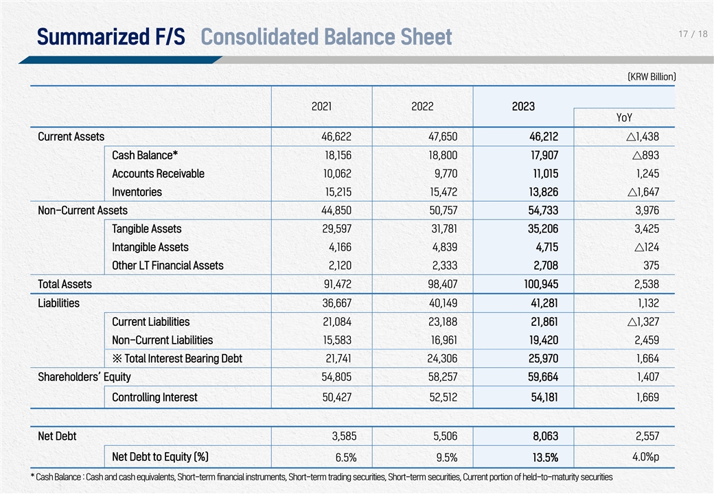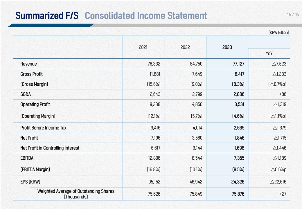 16 / 18 Summarized F/S Consolidated Income Statement (KRW Billion) 2021 2022 2023 YoY Revenue 76,332 84,750 77,127 △7,623 Gross Profit 11,881 7,649 6,417 △1,233 (Gross Margin) (15.6%) (9.0%) (8.3%) (△0.7%p) SG&A 2,643 2,799 2,886 +86 Operating Profit 9,238 4,850 3,531 △1,319 (Operating Margin) (12.1%) (5.7%) (4.6%) (△1.1%p) Profit Before Income Tax 9,416 4,014 2,635 △1,379 Net Profit 7,196 3,560 1,846 △1,715 Net Profit in Controlling Interest 6,617 3,144 1,698 △1,446 EBITDA 12,806 8,544 7,355 △1,189 (EBITDA Margin) (16.8%) (10.1%) (9.5%) △0.6%p EPS (KRW) 95,152 46,942 24,326 △22,616 Weighted Average of Outstanding Shares 75,626 75,849 75,876 +27 [Thousands)