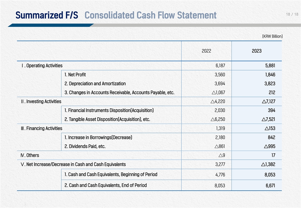 18 / 18 Summarized F/S Consolidated Cash Flow Statement (KRW Billion) 2022 2023 Ⅰ. Operating Activities 6,187 5,881 1. Net Profit 3,560 1,846 2. Depreciation and Amortization 3,694 3,823 3. Changes in Accounts Receivable, Accounts Payable, etc. △1,067 212 Ⅱ. Investing Activities △4,220 △7,127 1. Financial Instruments Disposition(Acquisition) 2,030 394 2. Tangible Asset Disposition(Acquisition), etc. △6,250 △7,521 Ⅲ. Financing Activities 1,319 △153 1. Increase in Borrowings(Decrease) 2,180 842 2. Dividends Paid, etc. △861 △995 Ⅳ. Others △9 17 Ⅴ. Net Increase/Decrease in Cash and Cash Equivalents 3,277 △1,382 1. Cash and Cash Equivalents, Beginning of Period 4,776 8,053 2. Cash and Cash Equivalents, End of Period 8,053 6,671