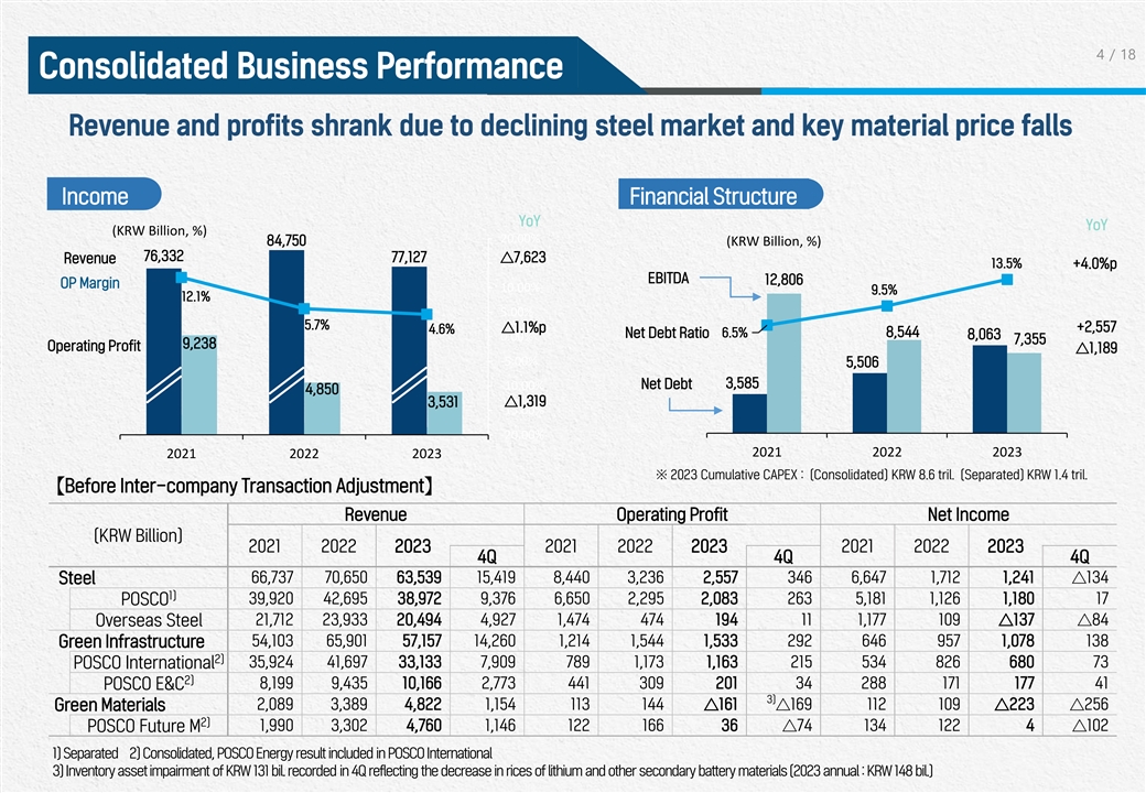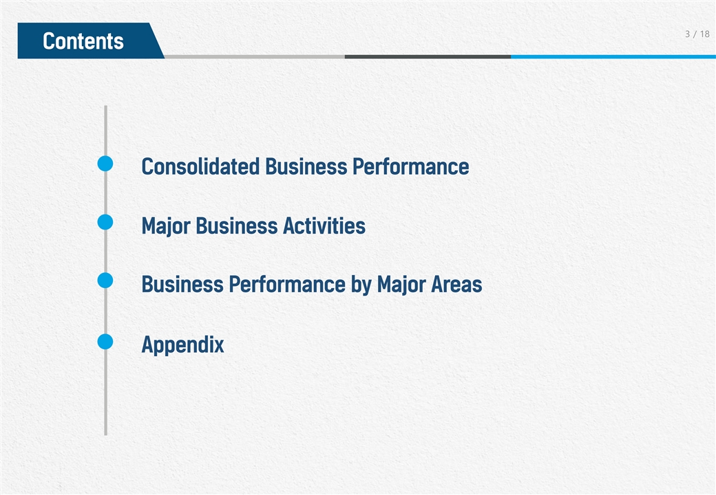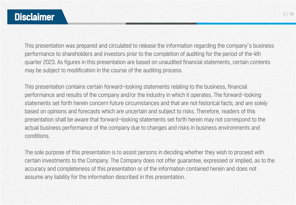 2 / 18 Disclaimer This presentation was prepared and circulated to release the information regarding the company’s business performance to shareholders and investors prior to the completion of auditing for the period of the 4th quarter 2023. As figures in this presentation are based on unaudited financial statements, certain contents may be subject to modification in the course of the auditing process. This presentation contains certain forward-looking statements relating to the business, financial performance and results of the company and/or the industry in which it operates. The forward-looking statements set forth herein concern future circumstances and that are not historical facts, and are solely based on opinions and forecasts which are uncertain and subject to risks. Therefore, readers of this presentation shall be aware that forward-looking statements set forth herein may not correspond to the actual business performance of the company due to changes and risks in business environments and conditions. The sole purpose of this presentation is to assist persons in deciding whether they wish to proceed with certain investments to the Company. The Company does not offer guarantee, expressed or implied, as to the accuracy and completeness of this presentation or of the information contained herein and does not assume any liability for the information described in this presentation.