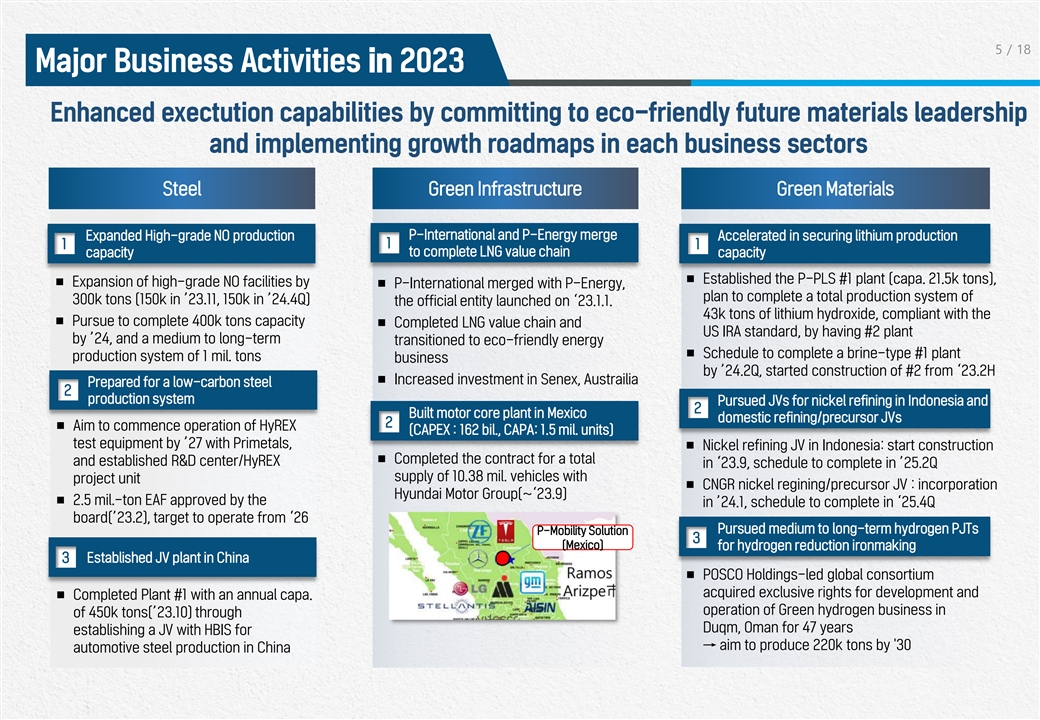 5 / 18 Major Business Activities in 2023 Enhanced exectution capabilities by committing to eco-friendly future materials leadership and implementing growth roadmaps in each business sectors Steel Green Infrastructure Green Materials P-International and P-Energy merge Expanded High-grade NO production Accelerated in securing lithium production 1 1 1 to complete LNG value chain capacity capacity n Established the P-PLS #1 plant (capa. 21.5k tons), n Expansion of high-grade NO facilities by n P-International merged with P-Energy, plan to complete a total production system of 300k tons (150k in ’23.11, 150k in ’24.4Q) the official entity launched on ‘23.1.1. 43k tons of lithium hydroxide, compliant with the n Pursue to complete 400k tons capacity n Completed LNG value chain and US IRA standard, by having #2 plant by ’24, and a medium to long-term transitioned to eco-friendly energy n Schedule to complete a brine-type #1 plant production system of 1 mil. tons business by ’24.2Q, started construction of #2 from ‘23.2H n Increased investment in Senex, Austrailia Prepared for a low-carbon steel 2 production system Pursued JVs for nickel refining in Indonesia and 2 Built motor core plant in Mexico domestic refining/precursor JVs 2 n Aim to commence operation of HyREX (CAPEX : 162 bil., CAPA: 1.5 mil. units) test equipment by ’27 with Primetals, n Nickel refining JV in Indonesia: start construction n Completed the contract for a total and established R&D center/HyREX in ‘23.9, schedule to complete in ’25.2Q supply of 10.38 mil. vehicles with project unit n CNGR nickel regining/precursor JV : incorporation Hyundai Motor Group(~‘23.9) n 2.5 mil.-ton EAF approved by the in ’24.1, schedule to complete in ‘25.4Q board(’23.2), target to operate from ‘26 Pursued medium to long-term hydrogen PJTs P-Mobility Solution 3 (Mexico) for hydrogen reduction ironmaking 3 Established JV plant in China n POSCO Holdings-led global consortium acquired exclusive rights for development and n Completed Plant #1 with an annual capa. operation of Green hydrogen business in of 450k tons(’23.10) through Duqm, Oman for 47 years establishing a JV with HBIS for → aim to produce 220k tons by '30 automotive steel production in China