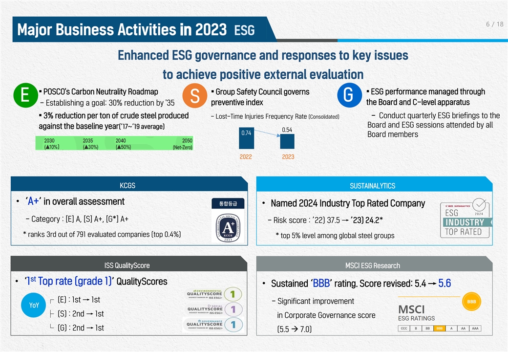 6 / 18 Major Business Activities in 2023 ESG Enhanced ESG governance and responses to key issues to achieve positive external evaluation ▪ POSCO's Carbon Neutrality Roadmap▪ ESG performance managed through ▪ Group Safety Council governs E G S preventive index the Board and C-level apparatus - Establishing a goal: 30% reduction by '35 ▪ 3% reduction per ton of crude steel produced - Conduct quarterly ESG briefings to the - Lost-Time Injuries Frequency Rate (Consolidated) Board and ESG sessions attended by all against the baseline year(’17~’19 average) 0.54 0.74 Board members ) 2022 2023 KCGS SUSTAINALYTICS • ‘A+’ in overall assessment • Named 2024 Industry Top Rated Company - Category : [E] A, [S] A+, [G*] A+ - Risk score : ’22) 37.5 → ’23) 24.2* * ranks 3rd out of 791 evaluated companies (top 0.4%) * top 5% level among global steel groups ISS QualityScore MSCI ESG Research st • ‘1 Top rate (grade 1)’ QualityScores • Sustained ‘BBB’ rating. Score revised: 5.4 → 5.6 ┌ (E) : 1st → 1st - Significant improvement YoY ├ (S) : 2nd → 1st in Corporate Governance score └ (G) : 2nd → 1st (5.5 à 7.0)