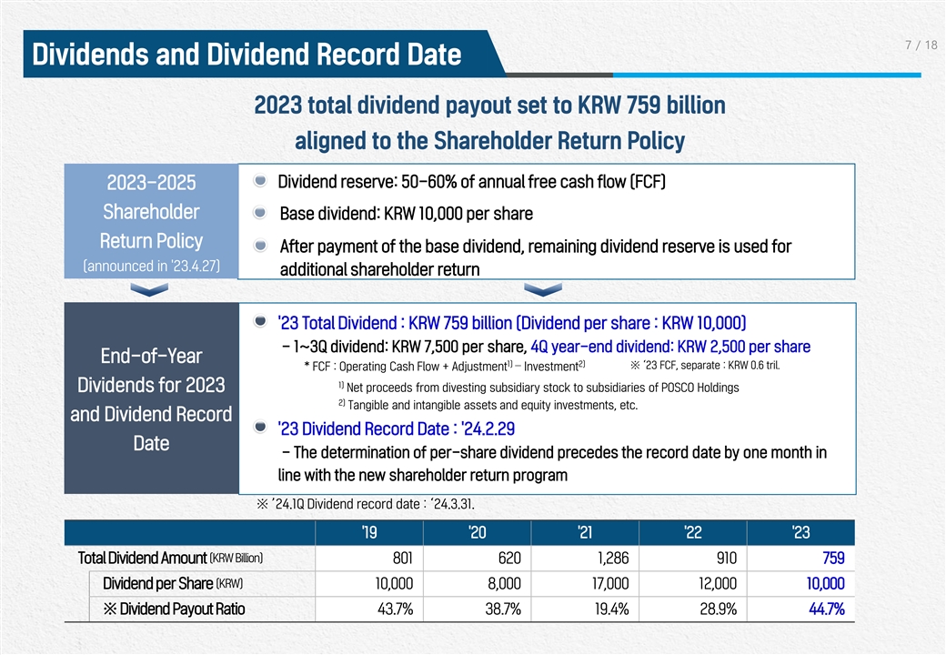 7 / 18 Dividends and Dividend Record Date 2023 total dividend payout set to KRW 759 billion aligned to the Shareholder Return Policy Dividend reserve: 50-60% of annual free cash flow (FCF) 2023-2025 Shareholder Base dividend: KRW 10,000 per share Return Policy After payment of the base dividend, remaining dividend reserve is used for (announced in '23.4.27) additional shareholder return '23 Total Dividend : KRW 759 billion (Dividend per share : KRW 10,000) - 1~3Q dividend: KRW 7,500 per share, 4Q year-end dividend: KRW 2,500 per share End-of-Year 1) 2) ※ ‘23 FCF, separate : KRW 0.6 tril. * FCF : Operating Cash Flow + Adjustment– Investment 1) Dividends for 2023 Net proceeds from divesting subsidiary stock to subsidiaries of POSCO Holdings 2) Tangible and intangible assets and equity investments, etc. and Dividend Record '23 Dividend Record Date : '24.2.29 Date - The determination of per-share dividend precedes the record date by one month in line with the new shareholder return program ※ ’24.1Q Dividend record date : ‘24.3.31. '19 '20 '21 '22 '23 (KRW Billion) Total Dividend Amount 801 620 1,286 910 759 (KRW) Dividend per Share 10,000 8,000 17,000 12,000 10,000 ※ Dividend Payout Ratio 43.7% 38.7% 19.4% 28.9% 44.7%