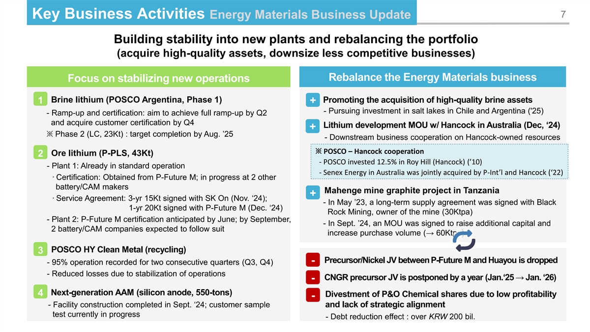 6 Key Business Activities Performance by Business Division in 2024 Energy Materials Infrastructure Steel New plant commissioning & Continue to drive gas field Invest in low-carbon steelmaking & expansion project explore offshore growth markets initial ramp-up operations 4-Stage expansion of the Myanmar HyREX technology development A suite of materials plants come on line 1 1 1 offshore gas field - Designated as a National Strategic Technology - P-Argentina completed facilities (upstream & - Stage 3: gas booster platform test run; P-Int’l (Jan.‘24) downstream) to produce 25Kt of LH (Oct. ‘24) began commercial operation (Apr. ‘24) - ‘H2-based Steelmaking Feedstock’ selected as - P-Silicon Solution commissioned 550-ton capacity - Stage 4: project kick-off in ’23 2H; basic plant MSIT’s global R&D flagship project (May ‘24) silicon anode material plants (Nov. ‘24) design began (Jul. ’24) - First batch of molten iron tapped from ESF - P-PLS completed 21.5Kt capacity LH Plant 2 (Apr.‘24) Senex 3x capacity expansion speeds up (Nov. ‘24) 2 - P-Int’l’s expansion project gained Australia’s JV integrated steelworks in India 2 Environment Protection and Biodiversity - POSCO-JSW signed MOU to seek Steel/Battery Conservation (EPBC) gov’t approval (Jun. ‘24) Materials/Energy collaboration (Oct. ‘24) - Agreed to raise A$ 650mil. in capital with - To build a 5Mt+ capacity JV integrated steel mill Hancock Energy. (P-Int’l 50.1%, A$ 326mil) - JV defines a 50:50 ownership split with equal number of directors on the Board No.1 in Korean remodeling construction 3 Continuous expansion of CAM plants 2 - POSCO E&C achieved an industry milestones EAF construction 3 - P-Future M’s Gwangyang NCA CAM plant broke as Korea’s first vertical extension remodeling - With the aim to reach its interim carbon net ground (52.5Kt, Feb. ‘24) construction service provider. It ranked No.1 zero miletone, POSCO began construction of in the nation’s remodeling order book. - P-Future M’s Pohang NCA CAM plant began a 2.5Mt EAF at Gwangyang Steelworks (Feb. ’24) operation at full capacity (30Kt, Oct. ’24)