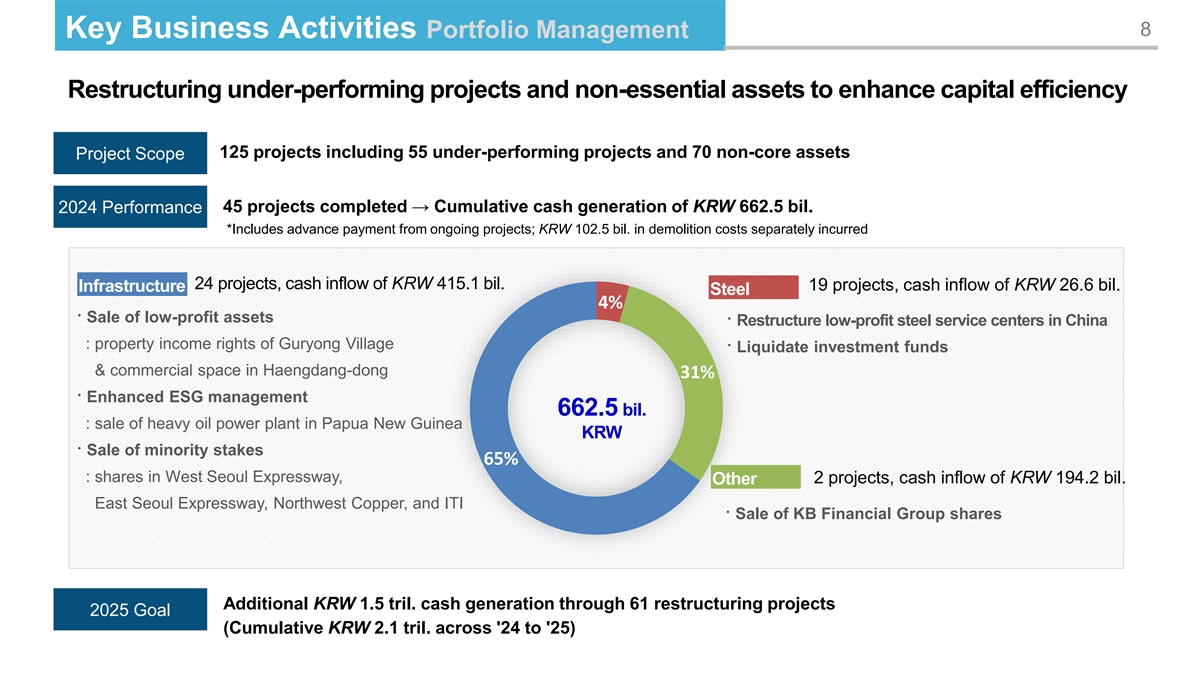 8 Key Business Activities Portfolio Management Restructuring under-performing projects and non-essential assets to enhance capital efficiency 125 projects including 55 under-performing projects and 70 non-core assets Project Scope 45 projects completed → Cumulative cash generation of KRW 662.5 bil. 2024 Performance *Includes advance payment from ongoing projects; KRW 102.5 bil. in demolition costs separately incurred 24 projects, cash inflow of KRW 415.1 bil. 19 projects, cash inflow of KRW 26.6 bil. Infrastructure Steel 4% 〮 Sale of low-profit assets 〮 Restructure low-profit steel service centers in China : property income rights of Guryong Village 〮 Liquidate investment funds & commercial space in Haengdang-dong 31% 〮 Enhanced ESG management 662.5 bil. : sale of heavy oil power plant in Papua New Guinea KRW 〮 Sale of minority stakes 65% : shares in West Seoul Expressway, 2 projects, cash inflow of KRW 194.2 bil. Other East Seoul Expressway, Northwest Copper, and ITI 〮 Sale of KB Financial Group shares Additional KRW 1.5 tril. cash generation through 61 restructuring projects 2025 Goal (Cumulative KRW 2.1 tril. across '24 to '25)