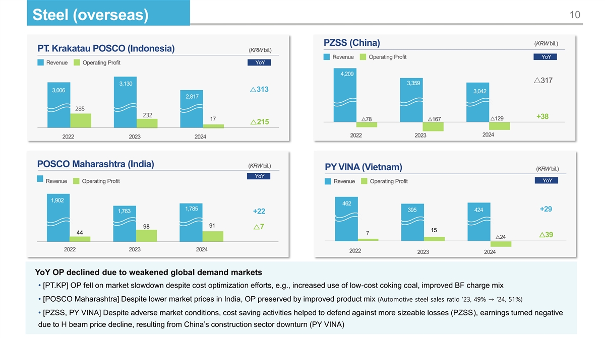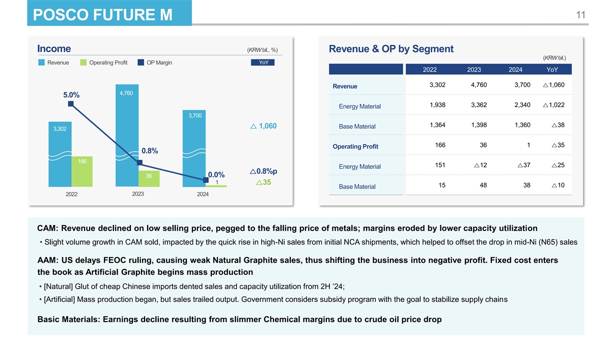 10 Steel (overseas) (KRW bil.) PZSS (China) PT. Krakatau POSCO (Indonesia) (KRW bil.) YoY Revenue Operating Profit YoY Revenue Operating Profit 4,209 △317 3,359 3,130 △313 3,006 3,042 2,817 285 232 +38 △129 17 △78△167 △215 2024 2022 2023 2022 2023 2024 POSCO Maharashtra (India) (KRW bil.) PY VINA (Vietnam) (KRW bil.) YoY YoY Revenue Operating Profit Revenue Operating Profit 1,902 462 1,785 +29 395 424 1,763 +22 91 98 △7 15 44 7 △39 △24 2022 2023 2024 2022 2023 2024 YoY OP declined due to weakened global demand markets • [PT.KP] OP fell on market slowdown despite cost optimization efforts, e.g., increased use of low-cost coking coal, improved BF charge mix • [POSCO Maharashtra] Despite lower market prices in India, OP preserved by improved product mix (Automotive steel sales ratio ’23, 49% → ‘24, 51%) • [PZSS, PY VINA] Despite adverse market conditions, cost saving activities helped to defend against more sizeable losses (PZSS), earnings turned negative due to H beam price decline, resulting from China’s construction sector downturn (PY VINA)