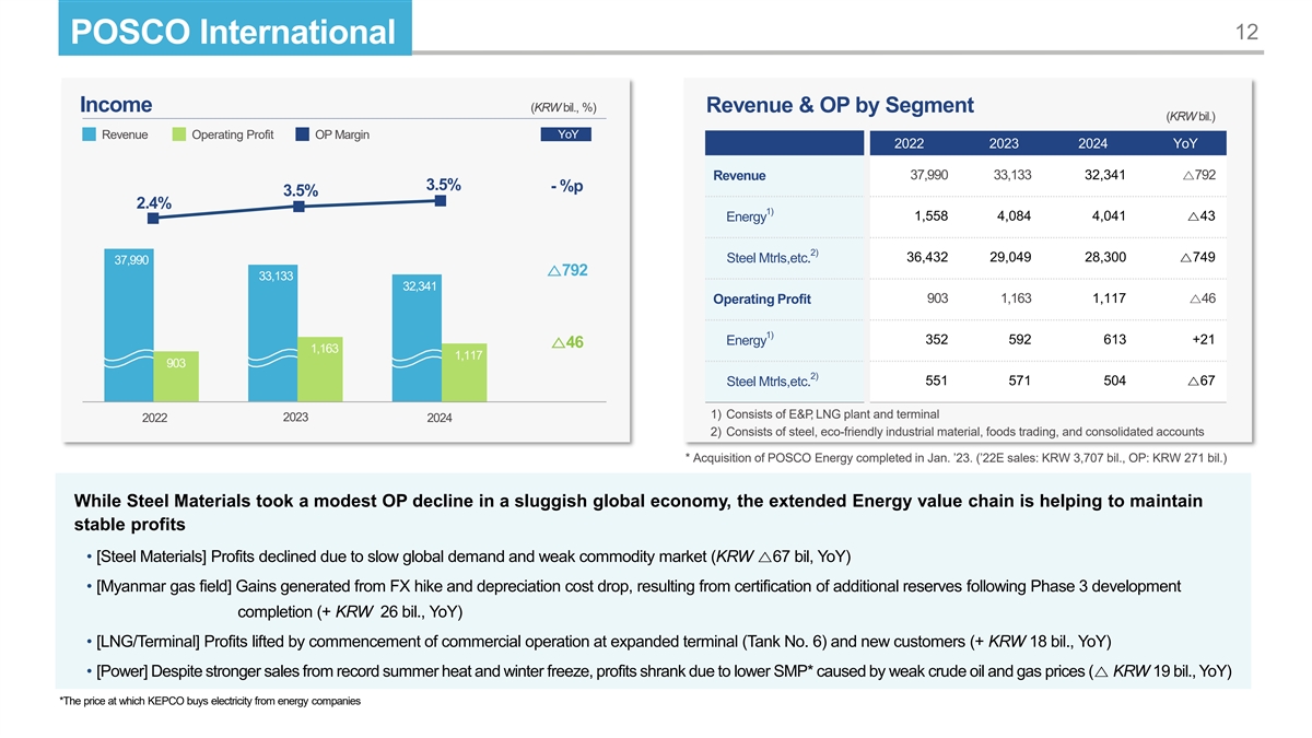11 POSCO FUTURE M Income (KRW bil., %) Revenue & OP by Segment (KRW bil.) YoY Revenue Operating Profit OP Margin 2022 2023 2024 YoY 3,302 4,760 3,700 △1,060 Revenue 4,760 5.0% 1,938 3,362 2,340 △1,022 Energy Material 3,700 1,364 1,398 1,360 △38 △ 1,060 Base Material 3,302 166 36 1 △35 Operating Profit 0.8% 166 151 △12 △37 △25 Energy Material △0.8%p 0.0% 36 1 △35 15 48 38 △10 Base Material 2023 2022 2024 CAM: Revenue declined on low selling price, pegged to the falling price of metals; margins eroded by lower capacity utilization • Slight volume growth in CAM sold, impacted by the quick rise in high-Ni sales from initial NCA shipments, which helped to offset the drop in mid-Ni (N65) sales AAM: US delays FEOC ruling, causing weak Natural Graphite sales, thus shifting the business into negative profit. Fixed cost enters the book as Artificial Graphite begins mass production • [Natural] Glut of cheap Chinese imports dented sales and capacity utilization from 2H ’24; • [Artificial] Mass production began, but sales trailed output. Government considers subsidy program with the goal to stabilize supply chains Basic Materials: Earnings decline resulting from slimmer Chemical margins due to crude oil price drop