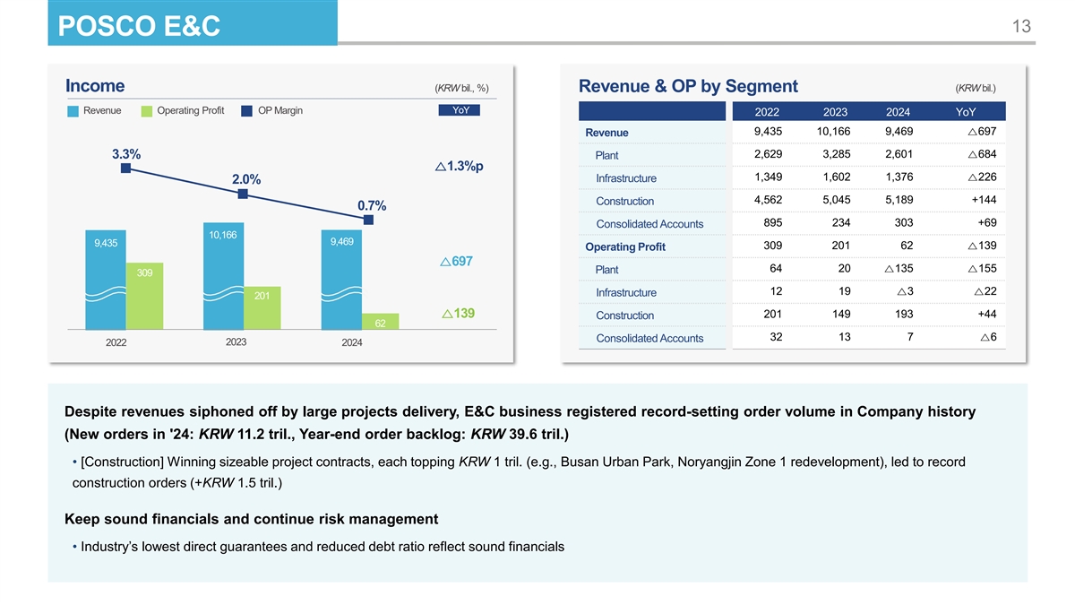 12 POSCO International Income (KRW bil., %) Revenue & OP by Segment (KRW bil.) YoY Revenue Operating Profit OP Margin 2022 2023 2024 YoY 37,990 33,133 32,341 △792 Revenue 3.5% - %p 3.5% 2.4% 1) 1,558 4,084 4,041 △43 Energy 2) Steel Mtrls,etc. 36,432 29,049 28,300 △749 37,990 △792 33,133 32,341 Operating Profit 903 1,163 1,117 △46 1) 352 592 613 +21 Energy △46 1,163 1,117 903 2) 551 571 504 △67 Steel Mtrls,etc. 1) Consists of E&P, LNG plant and terminal 2023 2022 2024 2) Consists of steel, eco-friendly industrial material, foods trading, and consolidated accounts * Acquisition of POSCO Energy completed in Jan. ’23. (’22E sales: KRW 3,707 bil., OP: KRW 271 bil.) While Steel Materials took a modest OP decline in a sluggish global economy, the extended Energy value chain is helping to maintain stable profits • [Steel Materials] Profits declined due to slow global demand and weak commodity market (KRW △67 bil, YoY) • [Myanmar gas field] Gains generated from FX hike and depreciation cost drop, resulting from certification of additional reserves following Phase 3 development completion (+ KRW 26 bil., YoY) • [LNG/Terminal] Profits lifted by commencement of commercial operation at expanded terminal (Tank No. 6) and new customers (+ KRW 18 bil., YoY) • [Power] Despite stronger sales from record summer heat and winter freeze, profits shrank due to lower SMP* caused by weak crude oil and gas prices (△ KRW 19 bil., YoY) *The price at which KEPCO buys electricity from energy companies