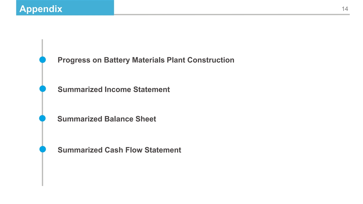 14 Appendix Progress on Battery Materials Plant Construction Summarized Income Statement Summarized Balance Sheet Summarized Cash Flow Statement