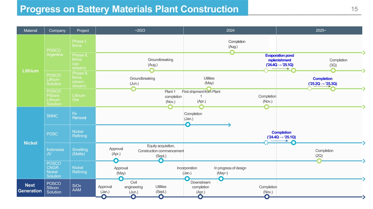 7 Key Business Activities Energy Materials Business Update Building stability into new plants and rebalancing the portfolio (acquire high-quality assets, downsize less competitive businesses) Rebalance the Energy Materials business Focus on stabilizing new operations Brine lithium (POSCO Argentina, Phase 1) Promoting the acquisition of high-quality brine assets 1 + - Pursuing investment in salt lakes in Chile and Argentina ('25) - Ramp-up and certification: aim to achieve full ramp-up by Q2 and acquire customer certification by Q4 Lithium development MOU w/ Hancock in Australia (Dec, ‘24) + ※ Phase 2 (LC, 23Kt) : target completion by Aug. ’25 - Downstream business cooperation on Hancock-owned resources ※ POSCO – Hancock cooperation Ore lithium (P-PLS, 43Kt) 2 - POSCO invested 12.5% in Roy Hill (Hancock) (’10) - Plant 1: Already in standard operation - Senex Energy in Australia was jointly acquired by P-Int’l and Hancock (‘22) · Certification: Obtained from P-Future M; in progress at 2 other battery/CAM makers Mahenge mine graphite project in Tanzania + · Service Agreement: 3-yr 15Kt signed with SK On (Nov. ‘24); - In May ’23, a long-term supply agreement was signed with Black 1-yr 20Kt signed with P-Future M (Dec. ‘24) Rock Mining, owner of the mine (30Ktpa) - Plant 2: P-Future M certification anticipated by June; by September, - In Sept. ’24, an MOU was signed to raise additional capital and 2 battery/CAM companies expected to follow suit increase purchase volume (→ 60Ktpa) POSCO HY Clean Metal (recycling) 3 Precursor/Nickel JV between P-Future M and Huayou is dropped - - 95% operation recorded for two consecutive quarters (Q3, Q4) - Reduced losses due to stabilization of operations CNGR precursor JV is postponed by a year (Jan.‘25 → Jan. ‘26) - Next-generation AAM (silicon anode, 550-tons) 4 Divestment of P&O Chemical shares due to low profitability - - Facility construction completed in Sept. ‘24; customer sample and lack of strategic alignment test currently in progress - Debt reduction effect : over KRW 200 bil.