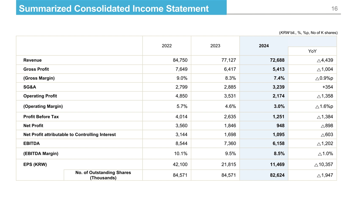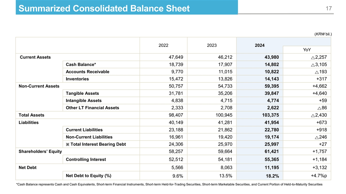 16 Summarized Consolidated Income Statement (KRW bil., %, %p, No of K shares) 2022 2023 2024 YoY Revenue 84,750 77,127 72,688 4,439 △ Gross Profit 7,649 6,417 5,413 1,004 △ (Gross Margin) 9.0% 8.3% 7.4% 0.9%p △ SG&A 2,799 2,885 3,239 +354 Operating Profit 4,850 3,531 2,174 1,358 △ (Operating Margin) 5.7% 4.6% 3.0% 1.6%p △ Profit Before Tax 4,014 2,635 1,251 1,384 △ Net Profit 3,560 1,846 948 898 △ Net Profit attributable to Controlling Interest 3,144 1,698 1,095 603 △ EBITDA 8,544 7,360 6,158 1,202 △ (EBITDA Margin) 10.1% 9.5% 8.5% 1.0% △ EPS (KRW) 42,100 21,815 11,469 10,357 △ No. of Outstanding Shares 84,571 84,571 82,624 1,947 △ (Thousands)