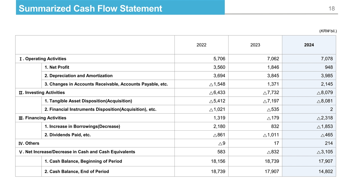 18 Summarized Cash Flow Statement (KRW bil.) 2022 2023 2024 . Operating Activities 5,706 7,062 7,078 Ⅰ 1. Net Profit 3,560 1,846 948 2. Depreciation and Amortization 3,694 3,845 3,985 3. Changes in Accounts Receivable, Accounts Payable, etc. 1,548 1,371 2,145 △ . Investing Activities 6,433 7,732 8,079 Ⅱ △ △ △ 1. Tangible Asset Disposition(Acquisition) 5,412 7,197 8,081 △ △ △ 2. Financial Instruments Disposition(Acquisition), etc. 1,021 535 2 △ △ . Financing Activities 1,319 179 2,318 Ⅲ △ △ 1. Increase in Borrowings(Decrease) 2,180 832 1,853 △ 2. Dividends Paid, etc. 861 1,011 465 △ △ △ . Others 9 17 214 Ⅳ △ . Net Increase/Decrease in Cash and Cash Equivalents Ⅴ 583 832 3,105 △ △ 1. Cash Balance, Beginning of Period 18,156 18,739 17,907 2. Cash Balance, End of Period 18,739 17,907 14,802