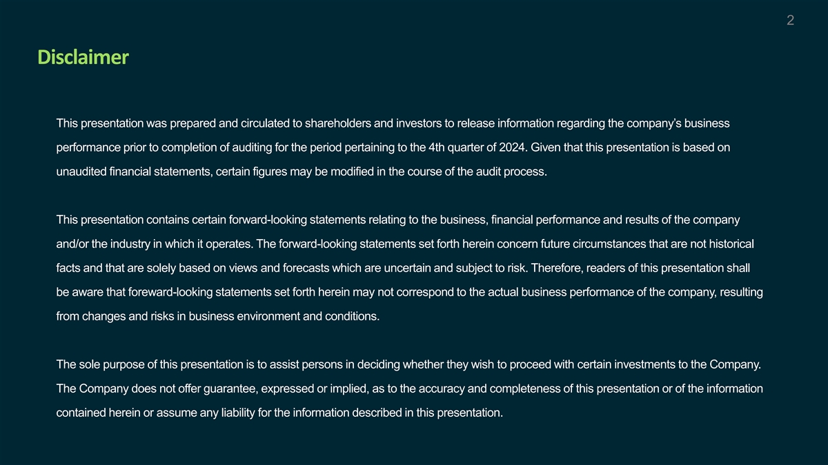 2 Disclaimer This presentation was prepared and circulated to shareholders and investors to release information regarding the company’s business performance prior to completion of auditing for the period pertaining to the 4th quarter of 2024. Given that this presentation is based on unaudited financial statements, certain figures may be modified in the course of the audit process. This presentation contains certain forward-looking statements relating to the business, financial performance and results of the company and/or the industry in which it operates. The forward-looking statements set forth herein concern future circumstances that are not historical facts and that are solely based on views and forecasts which are uncertain and subject to risk. Therefore, readers of this presentation shall be aware that foreward-looking statements set forth herein may not correspond to the actual business performance of the company, resulting from changes and risks in business environment and conditions. The sole purpose of this presentation is to assist persons in deciding whether they wish to proceed with certain investments to the Company. The Company does not offer guarantee, expressed or implied, as to the accuracy and completeness of this presentation or of the information contained herein or assume any liability for the information described in this presentation.