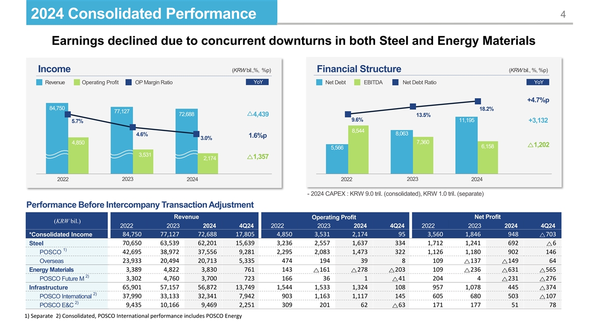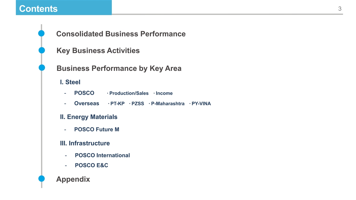 3 Contents Consolidated Business Performance Key Business Activities Business Performance by Key Area I. Steel - POSCO · Production/Sales · Income - Overseas · PT-KP · PZSS · P-Maharashtra · PY-VINA II. Energy Materials - POSCO Future M III. Infrastructure - POSCO International - POSCO E&C Appendix