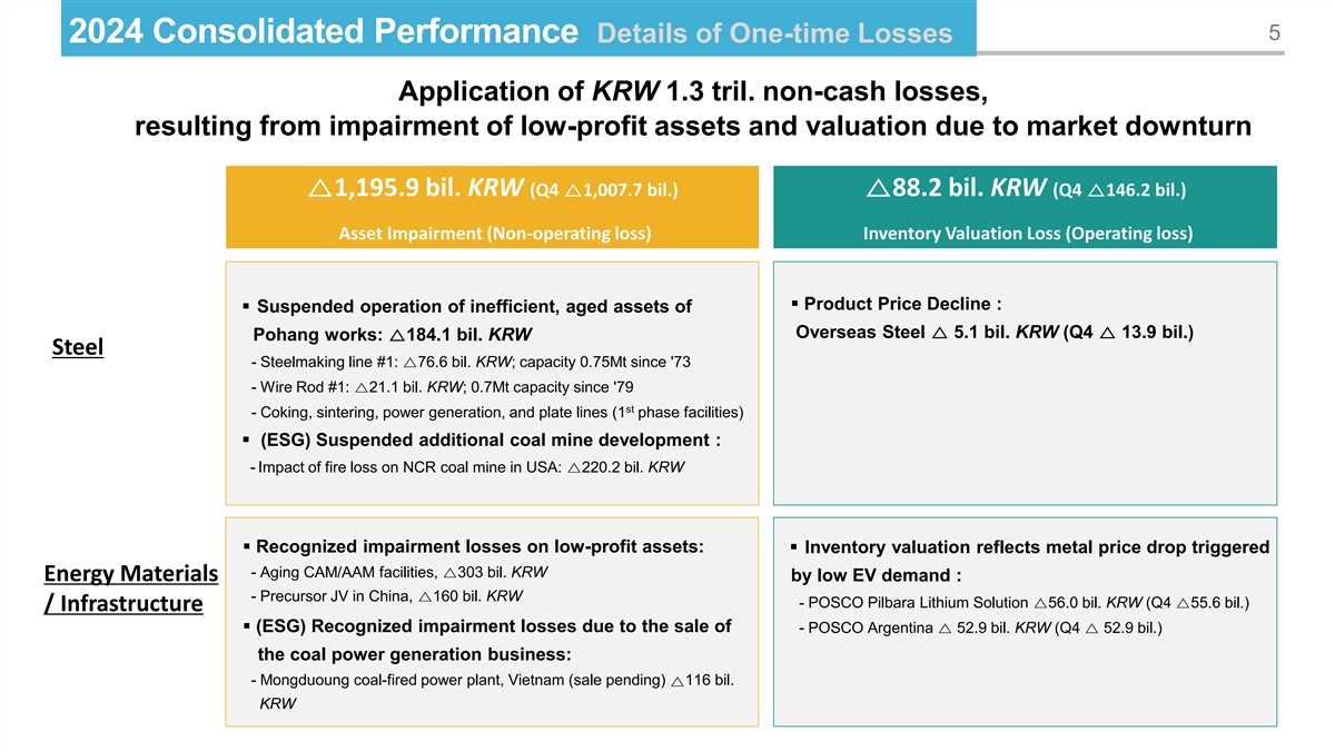 4 2024 Consolidated Performance Earnings declined due to concurrent downturns in both Steel and Energy Materials (KRW bil.,%, %p) (KRW bil., %, %p) Income Financial Structure YoY Revenue Operating Profit OP Margin Ratio Net Debt EBITDA Net Debt Ratio YoY +4.7%p 84,750 18.2% 77,127 72,688△ 4,439 13.5% 9.6% 11,195 5.7% +3,132 8,544 8,063 4.6% 1.6%p 3.0% 7,360 4,850 △1,202 6,158 5,566 3,531 △1,357 2,174 2023 2022 2024 2022 2023 2024 - 2024 CAPEX : KRW 9.0 tril. (consolidated), KRW 1.0 tril. (separate) Performance Before Intercompany Transaction Adjustment Revenue Net Profit Operating Profit (KRW bil.) 2022 2023 2024 4Q24 2022 2023 2024 4Q24 2022 2023 2024 4Q24 *Consolidated Income 84,750 77,127 72,688 17,805 4,850 3,531 2,174 95 3,560 1,846 948 703 △ Steel 70,650 63,539 62,201 15,639 3,236 2,557 1,637 334 1,712 1,241 692 6 △ 1) 42,695 38,972 37,556 9,281 2,295 2,083 1,473 322 1,126 1,180 902 146 POSCO Overseas 23,933 20,494 20,713 5,335 474 194 39 8 109 137 149 64 △ △ Energy Materials 3,389 4,822 3,830 761 143 161 278 203 109 236 631 565 △ △ △ △ △ △ 2) 3,302 4,760 3,700 723 166 36 1 41 204 4 231 276 POSCO Future M △ △ △ Infrastructure 65,901 57,157 56,872 13,749 1,544 1,533 1,324 108 957 1,078 445 374 △ 2) 37,990 33,133 32,341 7,942 903 1,163 1,117 145 605 680 503 107 POSCO International △ 2) POSCO E&C 9,435 10,166 9,469 2,251 309 201 62 △63 171 177 51 78 1) Separate 2) Consolidated, POSCO International performance includes POSCO Energy