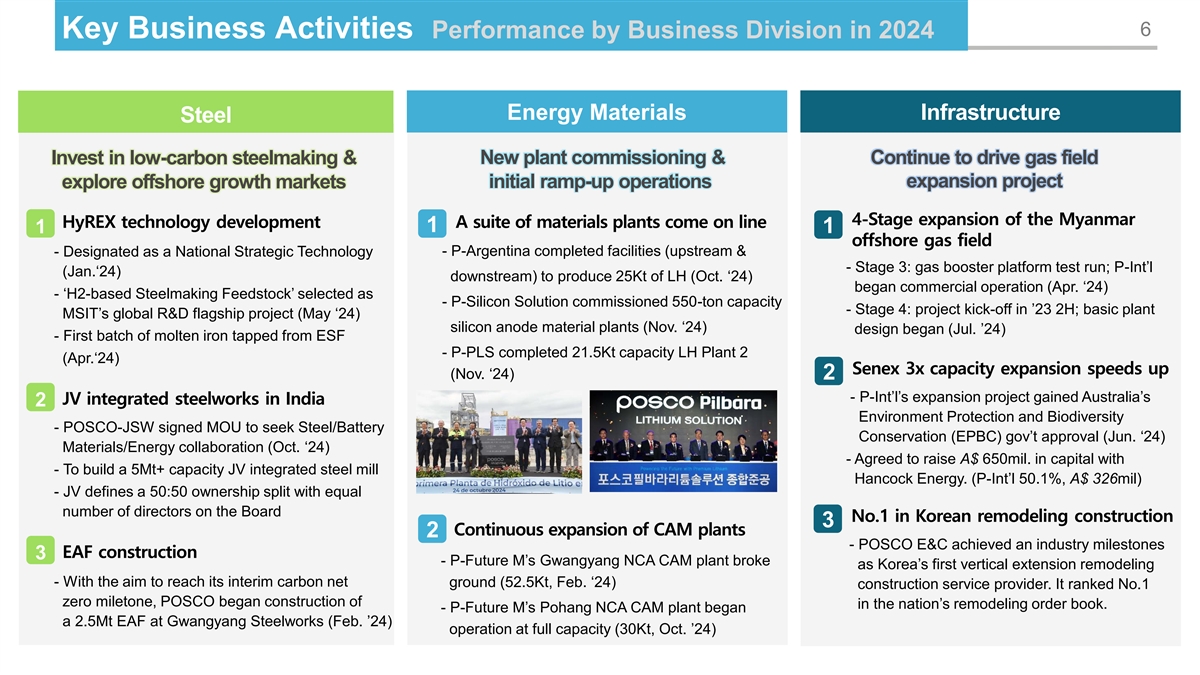5 2024 Consolidated Performance Details of One-time Losses Application of KRW 1.3 tril. non-cash losses, resulting from impairment of low-profit assets and valuation due to market downturn △1,195.9 bil. KRW (Q4 △1,007.7 bil.)△88.2 bil. KRW (Q4 △146.2 bil.) Asset Impairment (Non-operating loss) Inventory Valuation Loss (Operating loss) ▪ Product Price Decline : ▪ Suspended operation of inefficient, aged assets of Overseas Steel △ 5.1 bil. KRW (Q4 △ 13.9 bil.) Pohang works: △184.1 bil. KRW Steel - Steelmaking line #1: △76.6 bil. KRW; capacity 0.75Mt since '73 - Wire Rod #1: △21.1 bil. KRW; 0.7Mt capacity since '79 st - Coking, sintering, power generation, and plate lines (1 phase facilities) ▪ (ESG) Suspended additional coal mine development : - Impact of fire loss on NCR coal mine in USA: △220.2 bil. KRW ▪ Recognized impairment losses on low-profit assets: ▪ Inventory valuation reflects metal price drop triggered - Aging CAM/AAM facilities, △303 bil. KRW Energy Materials by low EV demand : - Precursor JV in China, △160 bil. KRW - POSCO Pilbara Lithium Solution △56.0 bil. KRW (Q4 △55.6 bil.) / Infrastructure ▪ (ESG) Recognized impairment losses due to the sale of - POSCO Argentina △ 52.9 bil. KRW (Q4 △ 52.9 bil.) the coal power generation business: - Mongduoung coal-fired power plant, Vietnam (sale pending) 116 bil. △ KRW