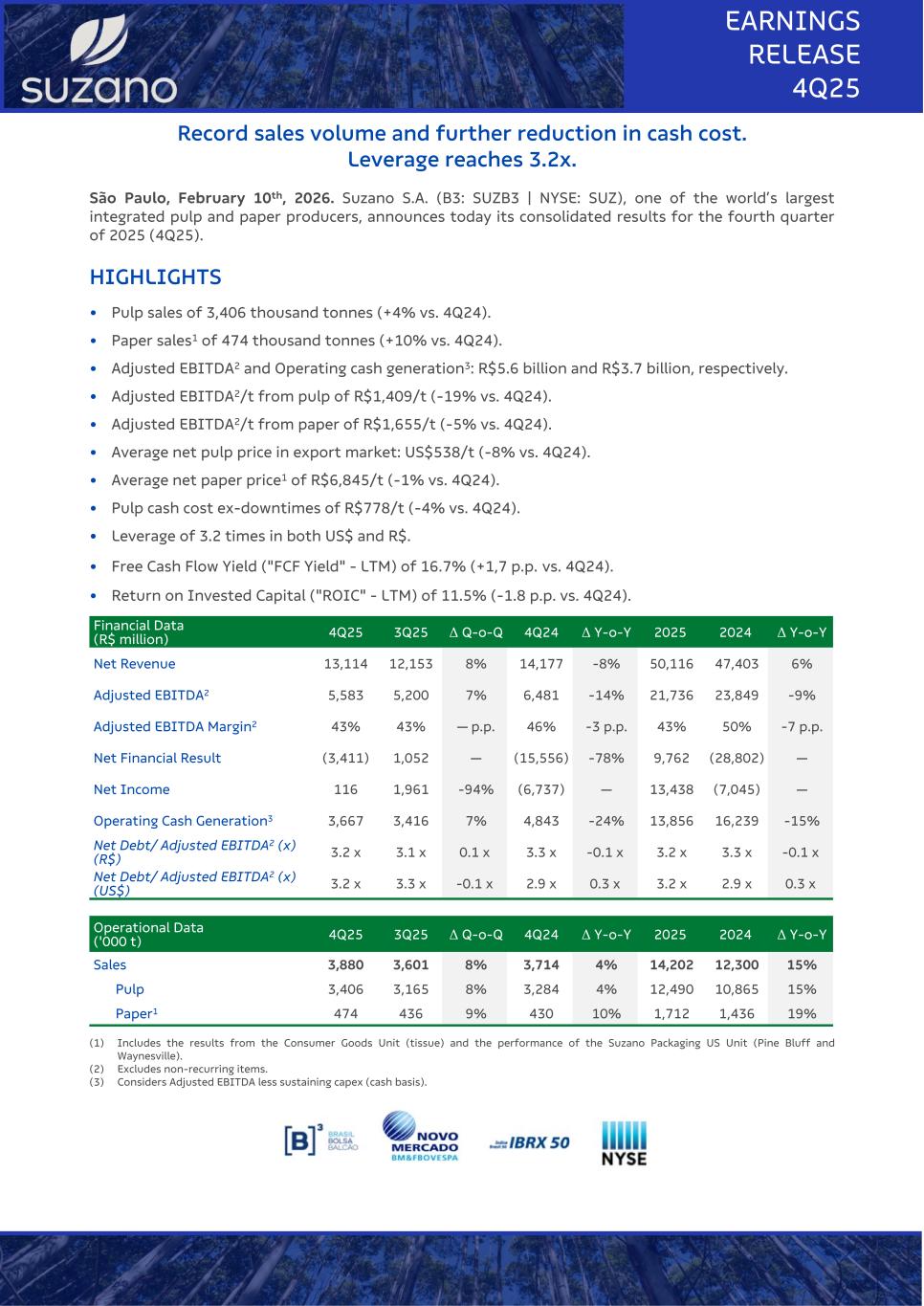 Record sales volume and further reduction in cash cost. Leverage reaches 3.2x. São Paulo, February 10th, 2026. Suzano S.A. (B3: SUZB3 | NYSE: SUZ), one of the world’s largest integrated pulp and paper producers, announces today its consolidated results for the fourth quarter of 2025 (4Q25). HIGHLIGHTS • Pulp sales of 3,406 thousand tonnes (+4% vs. 4Q24). • Paper sales1 of 474 thousand tonnes (+10% vs. 4Q24). • Adjusted EBITDA2 and Operating cash generation3: R$5.6 billion and R$3.7 billion, respectively. • Adjusted EBITDA2/t from pulp of R$1,409/t (-19% vs. 4Q24). • Adjusted EBITDA2/t from paper of R$1,655/t (-5% vs. 4Q24). • Average net pulp price in export market: US$538/t (-8% vs. 4Q24). • Average net paper price1 of R$6,845/t (-1% vs. 4Q24). • Pulp cash cost ex-downtimes of R$778/t (-4% vs. 4Q24). • Leverage of 3.2 times in both US$ and R$. • Free Cash Flow Yield ("FCF Yield" - LTM) of 16.7% (+1,7 p.p. vs. 4Q24). • Return on Invested Capital ("ROIC" - LTM) of 11.5% (-1.8 p.p. vs. 4Q24). Financial Data (R$ million) 4Q25 3Q25 Δ Q-o-Q 4Q24 Δ Y-o-Y 2025 2024 Δ Y-o-Y Net Revenue 13,114 12,153 8% 14,177 -8% 50,116 47,403 6% Adjusted EBITDA2 5,583 5,200 7% 6,481 -14% 21,736 23,849 -9% Adjusted EBITDA Margin2 43% 43% — p.p. 46% -3 p.p. 43% 50% -7 p.p. Net Financial Result (3,411) 1,052 — (15,556) -78% 9,762 (28,802) — Net Income 116 1,961 -94% (6,737) — 13,438 (7,045) — Operating Cash Generation3 3,667 3,416 7% 4,843 -24% 13,856 16,239 -15% Net Debt/ Adjusted EBITDA2 (x) (R$) 3.2 x 3.1 x 0.1 x 3.3 x -0.1 x 3.2 x 3.3 x -0.1 x Net Debt/ Adjusted EBITDA2 (x) (US$) 3.2 x 3.3 x -0.1 x 2.9 x 0.3 x 3.2 x 2.9 x 0.3 x Operational Data ('000 t) 4Q25 3Q25 Δ Q-o-Q 4Q24 Δ Y-o-Y 2025 2024 Δ Y-o-Y Sales 3,880 3,601 8% 3,714 4% 14,202 12,300 15% Pulp 3,406 3,165 8% 3,284 4% 12,490 10,865 15% Paper1 474 436 9% 430 10% 1,712 1,436 19% (1) Includes the results from the Consumer Goods Unit (tissue) and the performance of the Suzano Packaging US Unit (Pine Bluff and Waynesville). (2) Excludes non-recurring items. (3) Considers Adjusted EBITDA less sustaining capex (cash basis). EARNINGS RELEASE 4Q25