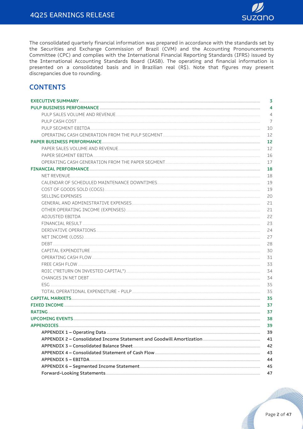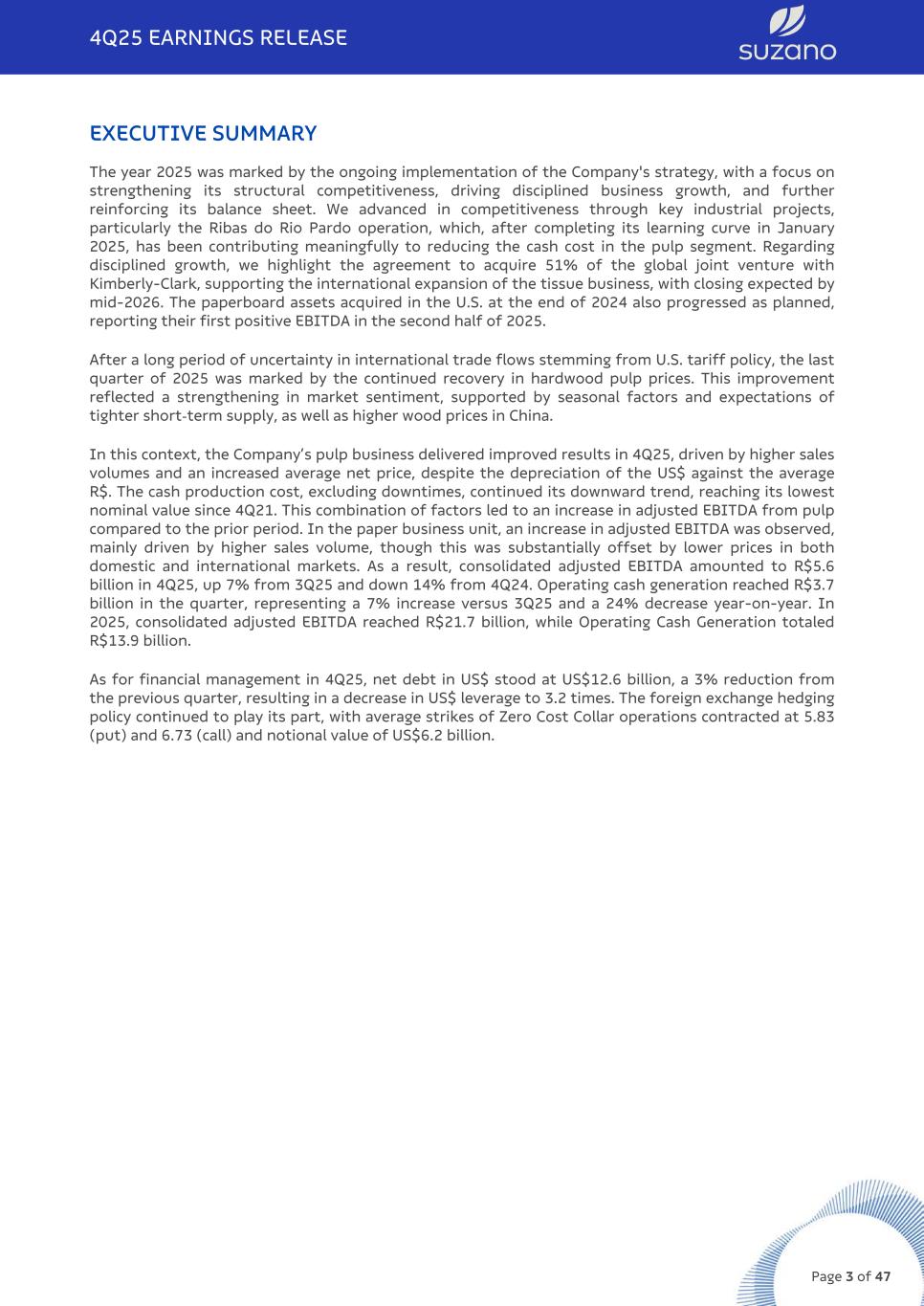 EXECUTIVE SUMMARY The year 2025 was marked by the ongoing implementation of the Company's strategy, with a focus on strengthening its structural competitiveness, driving disciplined business growth, and further reinforcing its balance sheet. We advanced in competitiveness through key industrial projects, particularly the Ribas do Rio Pardo operation, which, after completing its learning curve in January 2025, has been contributing meaningfully to reducing the cash cost in the pulp segment. Regarding disciplined growth, we highlight the agreement to acquire 51% of the global joint venture with Kimberly-Clark, supporting the international expansion of the tissue business, with closing expected by mid-2026. The paperboard assets acquired in the U.S. at the end of 2024 also progressed as planned, reporting their first positive EBITDA in the second half of 2025. After a long period of uncertainty in international trade flows stemming from U.S. tariff policy, the last quarter of 2025 was marked by the continued recovery in hardwood pulp prices. This improvement reflected a strengthening in market sentiment, supported by seasonal factors and expectations of tighter short-term supply, as well as higher wood prices in China. In this context, the Company’s pulp business delivered improved results in 4Q25, driven by higher sales volumes and an increased average net price, despite the depreciation of the US$ against the average R$. The cash production cost, excluding downtimes, continued its downward trend, reaching its lowest nominal value since 4Q21. This combination of factors led to an increase in adjusted EBITDA from pulp compared to the prior period. In the paper business unit, an increase in adjusted EBITDA was observed, mainly driven by higher sales volume, though this was substantially offset by lower prices in both domestic and international markets. As a result, consolidated adjusted EBITDA amounted to R$5.6 billion in 4Q25, up 7% from 3Q25 and down 14% from 4Q24. Operating cash generation reached R$3.7 billion in the quarter, representing a 7% increase versus 3Q25 and a 24% decrease year-on-year. In 2025, consolidated adjusted EBITDA reached R$21.7 billion, while Operating Cash Generation totaled R$13.9 billion. As for financial management in 4Q25, net debt in US$ stood at US$12.6 billion, a 3% reduction from the previous quarter, resulting in a decrease in US$ leverage to 3.2 times. The foreign exchange hedging policy continued to play its part, with average strikes of Zero Cost Collar operations contracted at 5.83 (put) and 6.73 (call) and notional value of US$6.2 billion. 4Q25 EARNINGS RELEASE Page 3 of 47