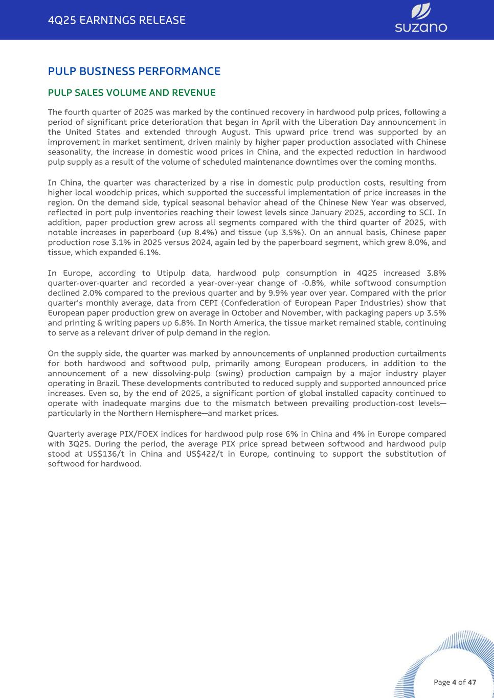PULP BUSINESS PERFORMANCE PULP SALES VOLUME AND REVENUE The fourth quarter of 2025 was marked by the continued recovery in hardwood pulp prices, following a period of significant price deterioration that began in April with the Liberation Day announcement in the United States and extended through August. This upward price trend was supported by an improvement in market sentiment, driven mainly by higher paper production associated with Chinese seasonality, the increase in domestic wood prices in China, and the expected reduction in hardwood pulp supply as a result of the volume of scheduled maintenance downtimes over the coming months. In China, the quarter was characterized by a rise in domestic pulp production costs, resulting from higher local woodchip prices, which supported the successful implementation of price increases in the region. On the demand side, typical seasonal behavior ahead of the Chinese New Year was observed, reflected in port pulp inventories reaching their lowest levels since January 2025, according to SCI. In addition, paper production grew across all segments compared with the third quarter of 2025, with notable increases in paperboard (up 8.4%) and tissue (up 3.5%). On an annual basis, Chinese paper production rose 3.1% in 2025 versus 2024, again led by the paperboard segment, which grew 8.0%, and tissue, which expanded 6.1%. In Europe, according to Utipulp data, hardwood pulp consumption in 4Q25 increased 3.8% quarter-over-quarter and recorded a year-over-year change of -0.8%, while softwood consumption declined 2.0% compared to the previous quarter and by 9.9% year over year. Compared with the prior quarter’s monthly average, data from CEPI (Confederation of European Paper Industries) show that European paper production grew on average in October and November, with packaging papers up 3.5% and printing & writing papers up 6.8%. In North America, the tissue market remained stable, continuing to serve as a relevant driver of pulp demand in the region. On the supply side, the quarter was marked by announcements of unplanned production curtailments for both hardwood and softwood pulp, primarily among European producers, in addition to the announcement of a new dissolving-pulp (swing) production campaign by a major industry player operating in Brazil. These developments contributed to reduced supply and supported announced price increases. Even so, by the end of 2025, a significant portion of global installed capacity continued to operate with inadequate margins due to the mismatch between prevailing production-cost levels— particularly in the Northern Hemisphere—and market prices. Quarterly average PIX/FOEX indices for hardwood pulp rose 6% in China and 4% in Europe compared with 3Q25. During the period, the average PIX price spread between softwood and hardwood pulp stood at US$136/t in China and US$422/t in Europe, continuing to support the substitution of softwood for hardwood. 4Q25 EARNINGS RELEASE Page 4 of 47