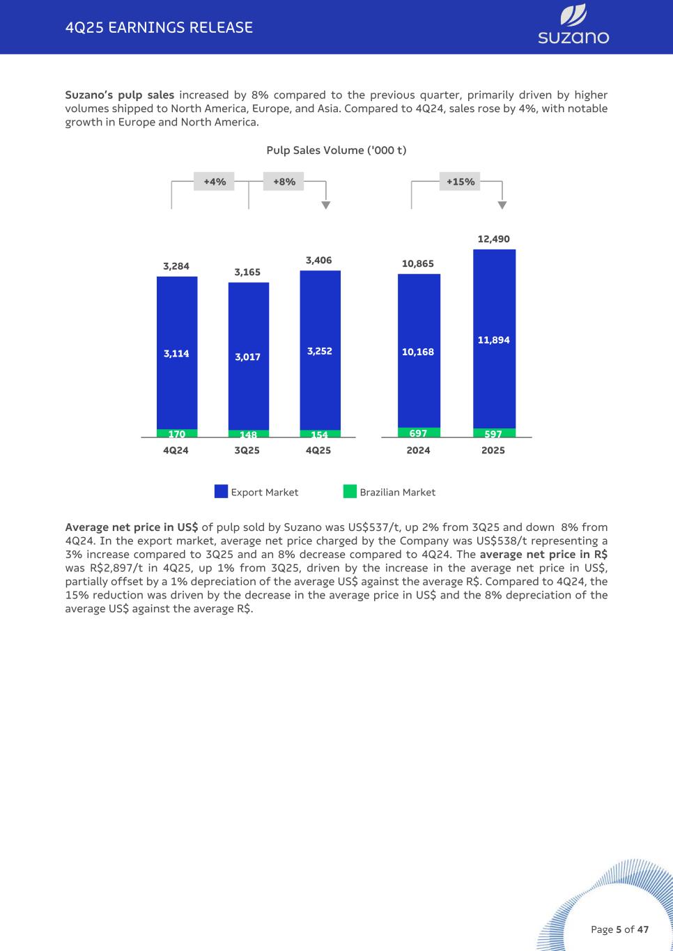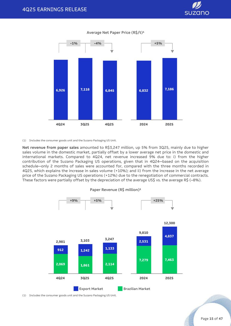 Suzano’s paper sales (printing & writing, paperboard and tissue) in the Brazilian market totaled 297 thousand tonnes in 4Q25, up 19% from the previous quarter, driven by higher sales of printing & writing (uncoated and coated paper) and tissue. Compared to 4Q24, paper sales increased 1%, mainly driven by the increase in coated and tissue products, partially offset by the slight decline in uncoated. International paper sales totaled 178 thousand tonnes, accounting for 37% of total sales volume in 4Q25. The 5% reduction compared to 3Q25 is explained by the reduction in exports in the uncoated segment from operations in Brazil as a result of the allocation strategy across markets and segments, driven by stronger domestic demand. In addition, there was a decline in volumes sold by Suzano Packaging US and in paperboard exports. The 29% increase over 4Q24 is attributable to the full-quarter consolidation of US operations' sales, whereas in 4Q24, only two months of sales were recognized due to the acquisition schedule, and by the increase in exports in the uncoated segment, offsetting the decrease in Brazilian export volumes (also resulted from the market and segment allocation strategy). Paper Sales Volume ('000 t) +10% +9% q +19% q 430 436 474 293 248 297 137 188 178 4Q24 3Q25 4Q25 1,436 1,712 1,003 1,001 432 711 2024 2025 Export Market Brazilian Market (1) Includes the consumer goods unit and the Suzano Packaging US Unit. The average net price decreased by 4% compared to the previous quarter, reflecting the reduction of 5% in the domestic market, mainly in the printing & writing and consumer goods segments, and 4% decrease in the international market, also explained primarily by the printing & writing segment. Compared to 4Q24, the 1% reduction was due to the decreases occurred in these same segments, with a particular impact from international market prices in the printing & writing segment, partly explained by the 8% depreciation of the average US$ against the average R$. These effects were partially offset by the increase in the net average price of Suzano Packaging US operations (+12%). 4Q25 EARNINGS RELEASE Page 14 of 47