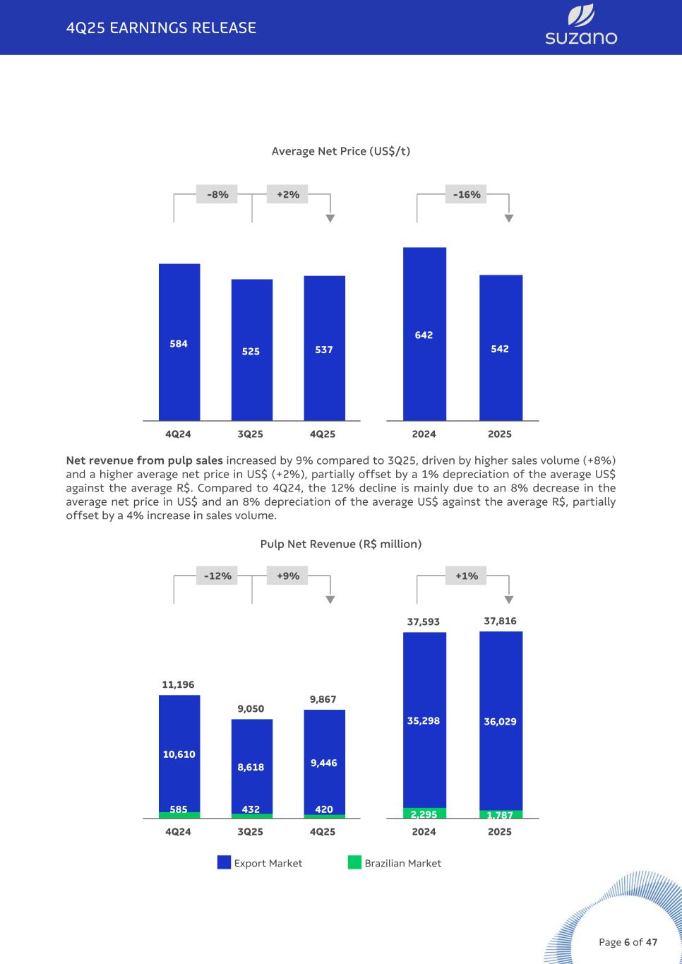 Suzano’s pulp sales increased by 8% compared to the previous quarter, primarily driven by higher volumes shipped to North America, Europe, and Asia. Compared to 4Q24, sales rose by 4%, with notable growth in Europe and North America. Pulp Sales Volume ('000 t) +4% +8% q +15% q 3,284 3,165 3,406 170 148 154 3,114 3,017 3,252 4Q24 3Q25 4Q25 10,865 12,490 697 597 10,168 11,894 2024 2025 Export Market Brazilian Market Average net price in US$ of pulp sold by Suzano was US$537/t, up 2% from 3Q25 and down 8% from 4Q24. In the export market, average net price charged by the Company was US$538/t representing a 3% increase compared to 3Q25 and an 8% decrease compared to 4Q24. The average net price in R$ was R$2,897/t in 4Q25, up 1% from 3Q25, driven by the increase in the average net price in US$, partially offset by a 1% depreciation of the average US$ against the average R$. Compared to 4Q24, the 15% reduction was driven by the decrease in the average price in US$ and the 8% depreciation of the average US$ against the average R$. 4Q25 EARNINGS RELEASE Page 5 of 47