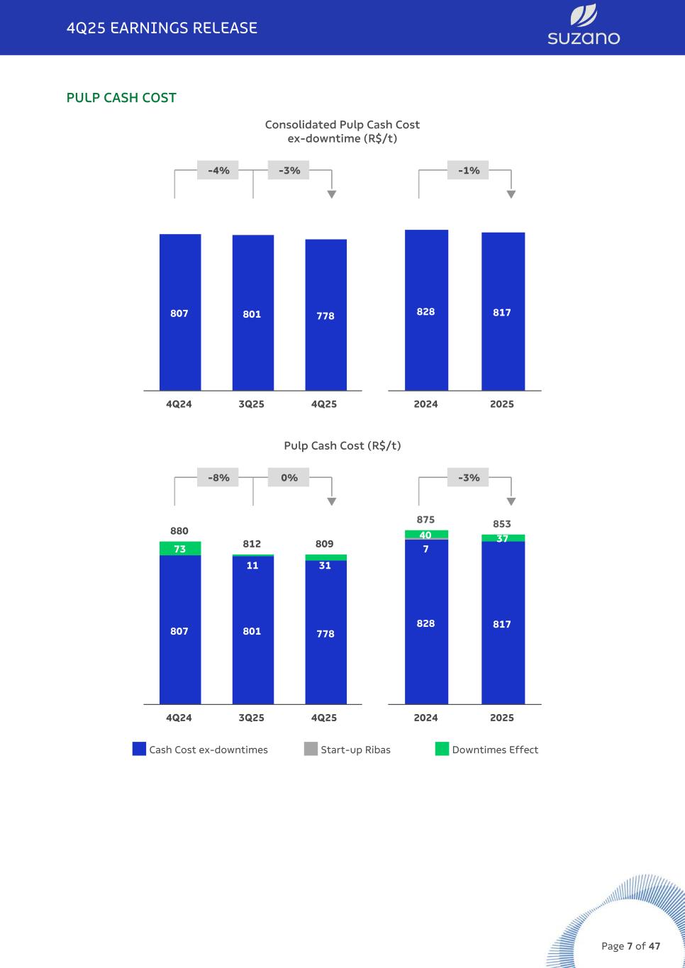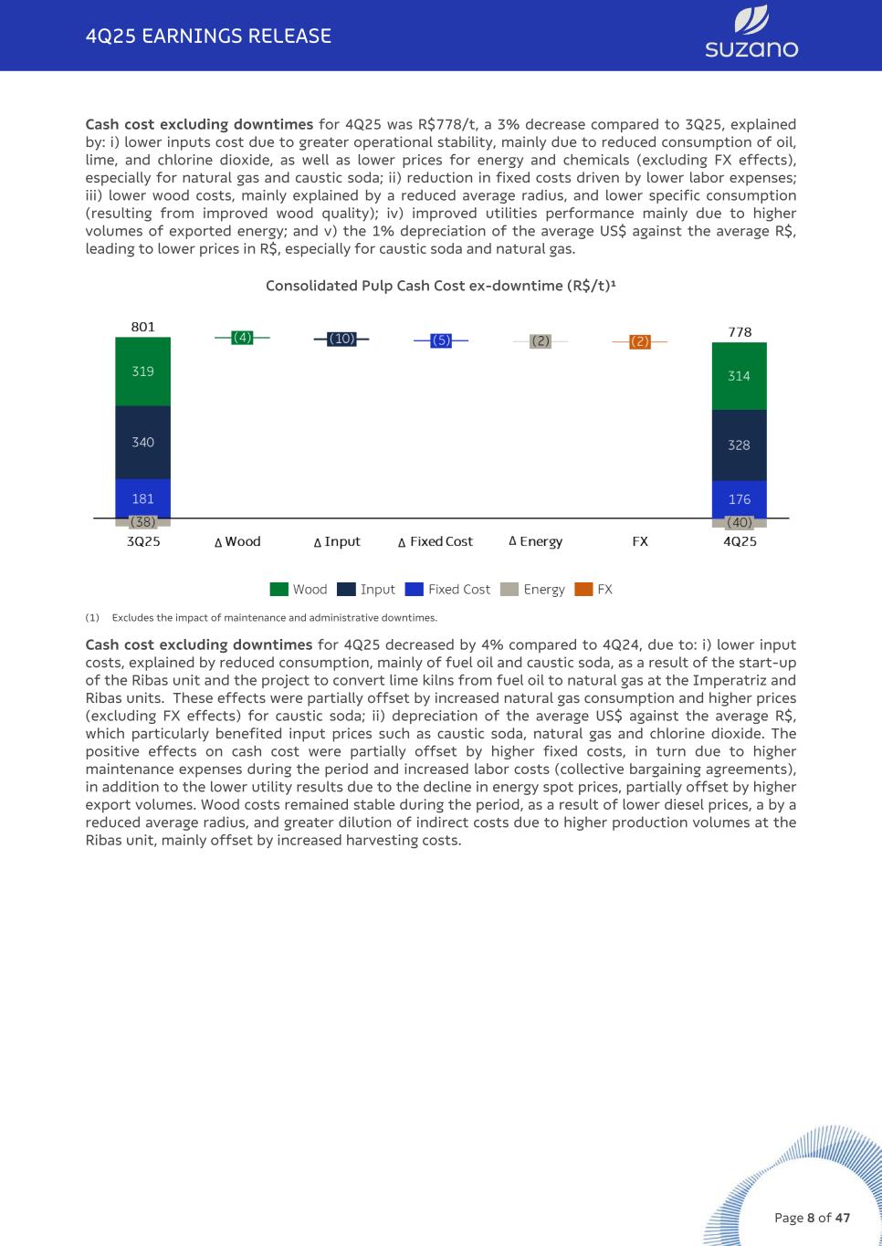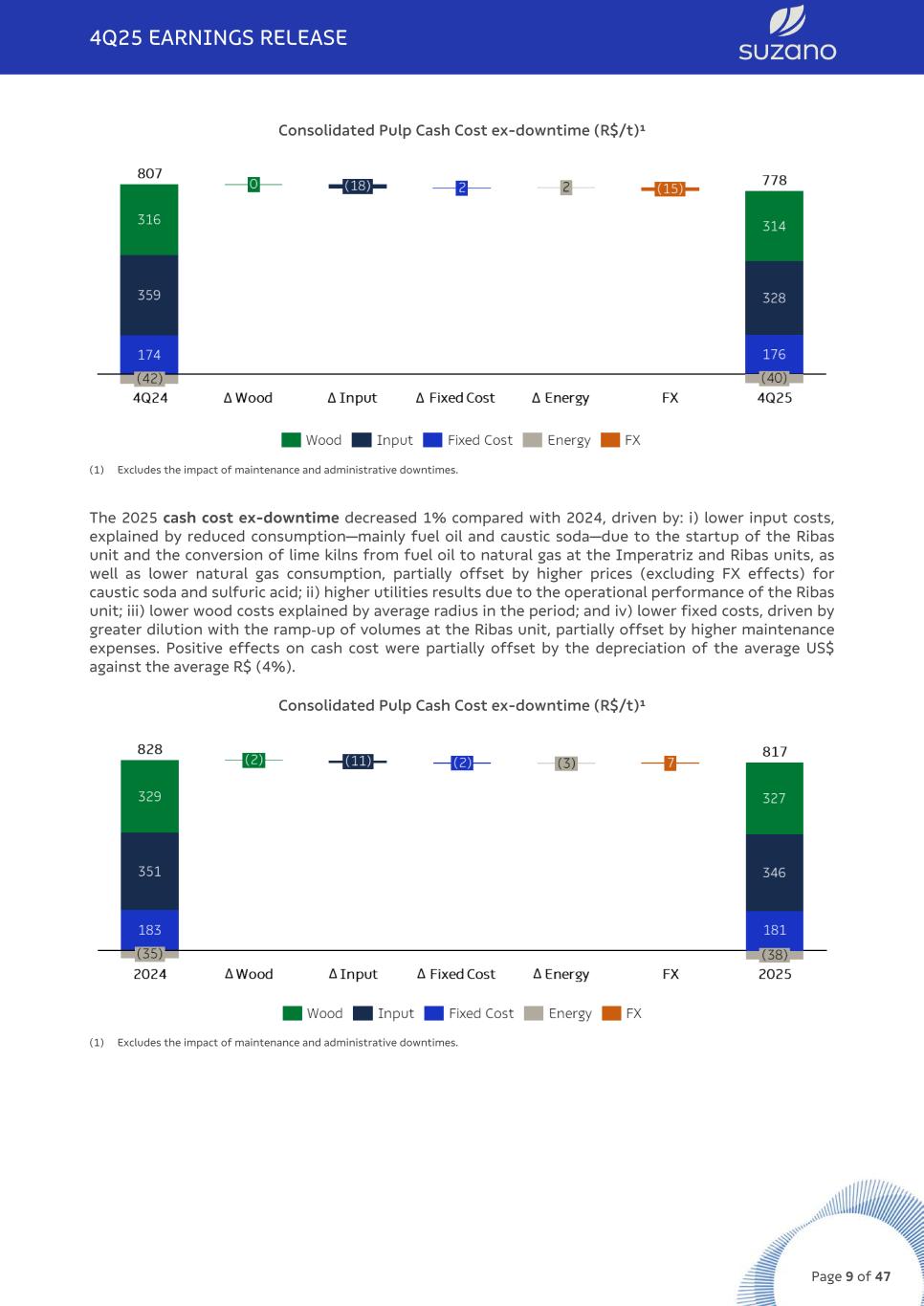 Cash cost excluding downtimes for 4Q25 was R$778/t, a 3% decrease compared to 3Q25, explained by: i) lower inputs cost due to greater operational stability, mainly due to reduced consumption of oil, lime, and chlorine dioxide, as well as lower prices for energy and chemicals (excluding FX effects), especially for natural gas and caustic soda; ii) reduction in fixed costs driven by lower labor expenses; iii) lower wood costs, mainly explained by a reduced average radius, and lower specific consumption (resulting from improved wood quality); iv) improved utilities performance mainly due to higher volumes of exported energy; and v) the 1% depreciation of the average US$ against the average R$, leading to lower prices in R$, especially for caustic soda and natural gas. Consolidated Pulp Cash Cost ex-downtime (R$/t)¹ (1) Excludes the impact of maintenance and administrative downtimes. Cash cost excluding downtimes for 4Q25 decreased by 4% compared to 4Q24, due to: i) lower input costs, explained by reduced consumption, mainly of fuel oil and caustic soda, as a result of the start-up of the Ribas unit and the project to convert lime kilns from fuel oil to natural gas at the Imperatriz and Ribas units. These effects were partially offset by increased natural gas consumption and higher prices (excluding FX effects) for caustic soda; ii) depreciation of the average US$ against the average R$, which particularly benefited input prices such as caustic soda, natural gas and chlorine dioxide. The positive effects on cash cost were partially offset by higher fixed costs, in turn due to higher maintenance expenses during the period and increased labor costs (collective bargaining agreements), in addition to the lower utility results due to the decline in energy spot prices, partially offset by higher export volumes. Wood costs remained stable during the period, as a result of lower diesel prices, a by a reduced average radius, and greater dilution of indirect costs due to higher production volumes at the Ribas unit, mainly offset by increased harvesting costs. 4Q25 EARNINGS RELEASE Page 8 of 47