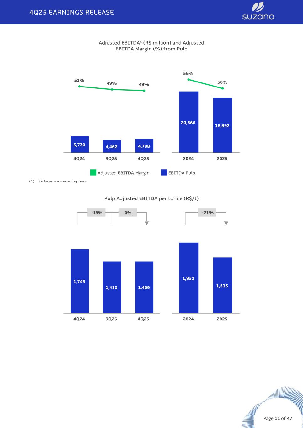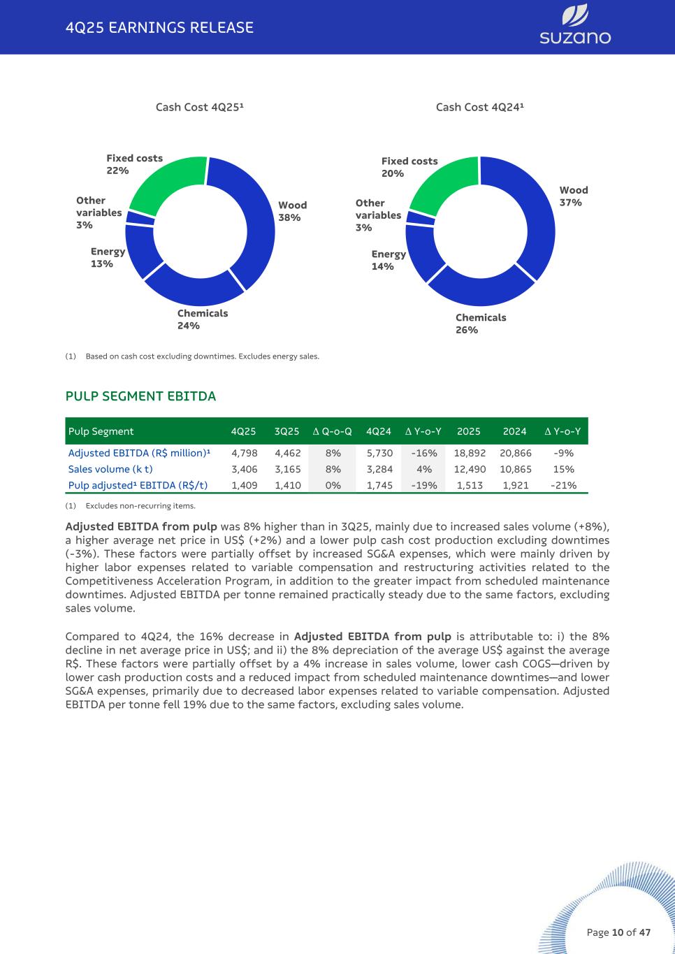 Cash Cost 4Q25¹ Fixed costs 22% Wood 38% Chemicals 24% Energy 13% Other variables 3% Cash Cost 4Q24¹ Fixed costs 20% Wood 37% Chemicals 26% Energy 14% Other variables 3% (1) Based on cash cost excluding downtimes. Excludes energy sales. PULP SEGMENT EBITDA Pulp Segment 4Q25 3Q25 Δ Q-o-Q 4Q24 Δ Y-o-Y 2025 2024 Δ Y-o-Y Adjusted EBITDA (R$ million)¹ 4,798 4,462 8% 5,730 -16% 18,892 20,866 -9% Sales volume (k t) 3,406 3,165 8% 3,284 4% 12,490 10,865 15% Pulp adjusted¹ EBITDA (R$/t) 1,409 1,410 0% 1,745 -19% 1,513 1,921 -21% (1) Excludes non-recurring items. Adjusted EBITDA from pulp was 8% higher than in 3Q25, mainly due to increased sales volume (+8%), a higher average net price in US$ (+2%) and a lower pulp cash cost production excluding downtimes (-3%). These factors were partially offset by increased SG&A expenses, which were mainly driven by higher labor expenses related to variable compensation and restructuring activities related to the Competitiveness Acceleration Program, in addition to the greater impact from scheduled maintenance downtimes. Adjusted EBITDA per tonne remained practically steady due to the same factors, excluding sales volume. Compared to 4Q24, the 16% decrease in Adjusted EBITDA from pulp is attributable to: i) the 8% decline in net average price in US$; and ii) the 8% depreciation of the average US$ against the average R$. These factors were partially offset by a 4% increase in sales volume, lower cash COGS—driven by lower cash production costs and a reduced impact from scheduled maintenance downtimes—and lower SG&A expenses, primarily due to decreased labor expenses related to variable compensation. Adjusted EBITDA per tonne fell 19% due to the same factors, excluding sales volume. 4Q25 EARNINGS RELEASE Page 10 of 47