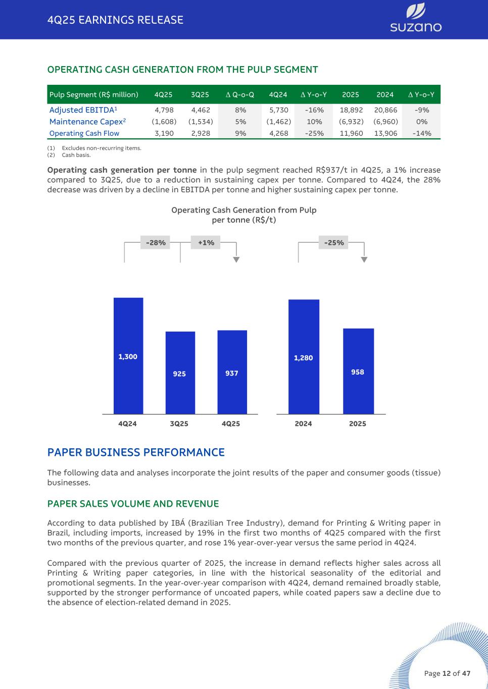 OPERATING CASH GENERATION FROM THE PULP SEGMENT Pulp Segment (R$ million) 4Q25 3Q25 Δ Q-o-Q 4Q24 Δ Y-o-Y 2025 2024 Δ Y-o-Y Adjusted EBITDA1 4,798 4,462 8% 5,730 -16% 18,892 20,866 -9% Maintenance Capex2 (1,608) (1,534) 5% (1,462) 10% (6,932) (6,960) 0% Operating Cash Flow 3,190 2,928 9% 4,268 -25% 11,960 13,906 -14% (1) Excludes non-recurring items. (2) Cash basis. Operating cash generation per tonne in the pulp segment reached R$937/t in 4Q25, a 1% increase compared to 3Q25, due to a reduction in sustaining capex per tonne. Compared to 4Q24, the 28% decrease was driven by a decline in EBITDA per tonne and higher sustaining capex per tonne. Operating Cash Generation from Pulp per tonne (R$/t) -28% +1% q -25% q 1,300 925 937 4Q24 3Q25 4Q25 1,280 958 2024 2025 PAPER BUSINESS PERFORMANCE The following data and analyses incorporate the joint results of the paper and consumer goods (tissue) businesses. PAPER SALES VOLUME AND REVENUE According to data published by IBÁ (Brazilian Tree Industry), demand for Printing & Writing paper in Brazil, including imports, increased by 19% in the first two months of 4Q25 compared with the first two months of the previous quarter, and rose 1% year-over-year versus the same period in 4Q24. Compared with the previous quarter of 2025, the increase in demand reflects higher sales across all Printing & Writing paper categories, in line with the historical seasonality of the editorial and promotional segments. In the year-over-year comparison with 4Q24, demand remained broadly stable, supported by the stronger performance of uncoated papers, while coated papers saw a decline due to the absence of election-related demand in 2025. 4Q25 EARNINGS RELEASE Page 12 of 47