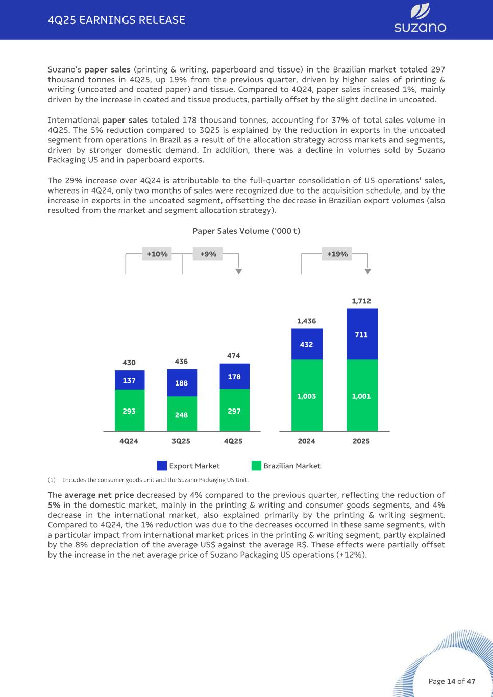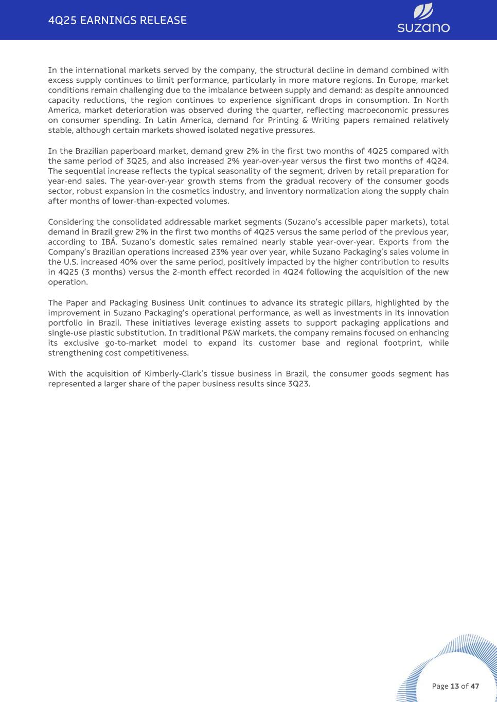 In the international markets served by the company, the structural decline in demand combined with excess supply continues to limit performance, particularly in more mature regions. In Europe, market conditions remain challenging due to the imbalance between supply and demand: as despite announced capacity reductions, the region continues to experience significant drops in consumption. In North America, market deterioration was observed during the quarter, reflecting macroeconomic pressures on consumer spending. In Latin America, demand for Printing & Writing papers remained relatively stable, although certain markets showed isolated negative pressures. In the Brazilian paperboard market, demand grew 2% in the first two months of 4Q25 compared with the same period of 3Q25, and also increased 2% year-over-year versus the first two months of 4Q24. The sequential increase reflects the typical seasonality of the segment, driven by retail preparation for year-end sales. The year-over-year growth stems from the gradual recovery of the consumer goods sector, robust expansion in the cosmetics industry, and inventory normalization along the supply chain after months of lower-than-expected volumes. Considering the consolidated addressable market segments (Suzano’s accessible paper markets), total demand in Brazil grew 2% in the first two months of 4Q25 versus the same period of the previous year, according to IBÁ. Suzano’s domestic sales remained nearly stable year-over-year. Exports from the Company’s Brazilian operations increased 23% year over year, while Suzano Packaging’s sales volume in the U.S. increased 40% over the same period, positively impacted by the higher contribution to results in 4Q25 (3 months) versus the 2-month effect recorded in 4Q24 following the acquisition of the new operation. The Paper and Packaging Business Unit continues to advance its strategic pillars, highlighted by the improvement in Suzano Packaging’s operational performance, as well as investments in its innovation portfolio in Brazil. These initiatives leverage existing assets to support packaging applications and single-use plastic substitution. In traditional P&W markets, the company remains focused on enhancing its exclusive go-to-market model to expand its customer base and regional footprint, while strengthening cost competitiveness. With the acquisition of Kimberly-Clark’s tissue business in Brazil, the consumer goods segment has represented a larger share of the paper business results since 3Q23. 4Q25 EARNINGS RELEASE Page 13 of 47
