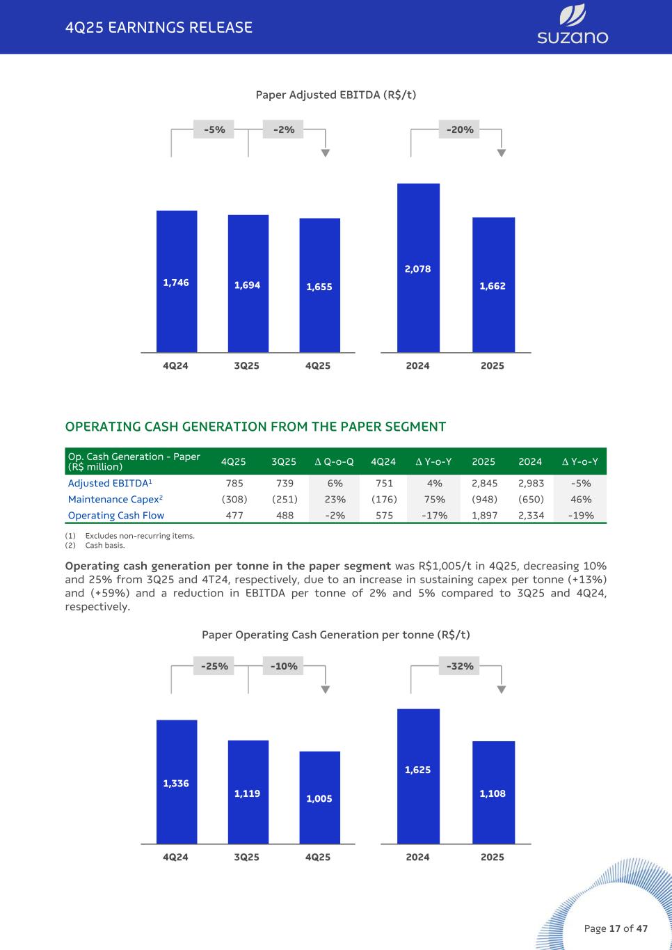 PAPER SEGMENT EBITDA Paper Segment 4Q25 3Q25 Δ Q-o-Q 4Q24 Δ Y-o-Y 2025 2024 Δ Y-o-Y Adjusted EBITDA (R$ million)1 785 739 6% 751 4% 2,845 2,983 -5% Sales volume (k t) 474 436 9% 430 10% 1,712 1,436 19% Paper adjusted1 EBITDA (R$/t) 1,655 1,694 -2% 1,746 -5% 1,662 2,078 -20% (1) Excludes non-recurring items. Adjusted EBITDA from paper increased 6% from 3Q25, mainly due to higher sales volume (+9%), partially offset by lower average net price. Adjusted EBITDA per tonne declined 2% mainly due to lower net prices. Compared to 4Q24, the 4% increase was primarily driven by: i) lower SG&A expenses (mainly due to the lower provision for variable compensation); ii) higher sales volume (10%); and iii) an incremental price effect due to the Suzano Packaging operation (+12%), as mentioned earlier, resulting from the renegotiation of commercial contracts. These effects were partially offset by higher cash COGS (largely explained by the impact of scheduled maintenance downtimes) and the 8% depreciation of the average US$ against the average R$. Adjusted EBITDA per tonne decreased 5% mainly due to the higher cash COGS (+20%) and the 8% depreciation of the average US$ against the average R$, effects partially offset by the higher prices observed in the Suzano Packaging US operation. Adjusted EBITDA (R$ million) and Adjusted EBITDA Margin (%) from Paper 751 739 785 25% 24% 24% 4Q24 3Q25 4Q25 2,983 2,845 30% 23% 2024 2025 Adjusted EBITDA Margin EBITDA Paper 4Q25 EARNINGS RELEASE Page 16 of 47