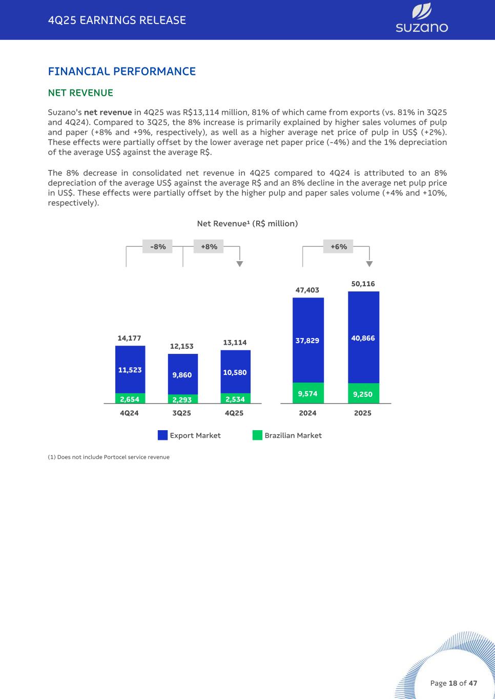 FINANCIAL PERFORMANCE NET REVENUE Suzano's net revenue in 4Q25 was R$13,114 million, 81% of which came from exports (vs. 81% in 3Q25 and 4Q24). Compared to 3Q25, the 8% increase is primarily explained by higher sales volumes of pulp and paper (+8% and +9%, respectively), as well as a higher average net price of pulp in US$ (+2%). These effects were partially offset by the lower average net paper price (-4%) and the 1% depreciation of the average US$ against the average R$. The 8% decrease in consolidated net revenue in 4Q25 compared to 4Q24 is attributed to an 8% depreciation of the average US$ against the average R$ and an 8% decline in the average net pulp price in US$. These effects were partially offset by the higher pulp and paper sales volume (+4% and +10%, respectively). Net Revenue¹ (R$ million) -8% +8% q +6% q 14,177 12,153 13,114 2,654 2,293 2,534 11,523 9,860 10,580 4Q24 3Q25 4Q25 47,403 50,116 9,574 9,250 37,829 40,866 2024 2025 Export Market Brazilian Market (1) Does not include Portocel service revenue 4Q25 EARNINGS RELEASE Page 18 of 47