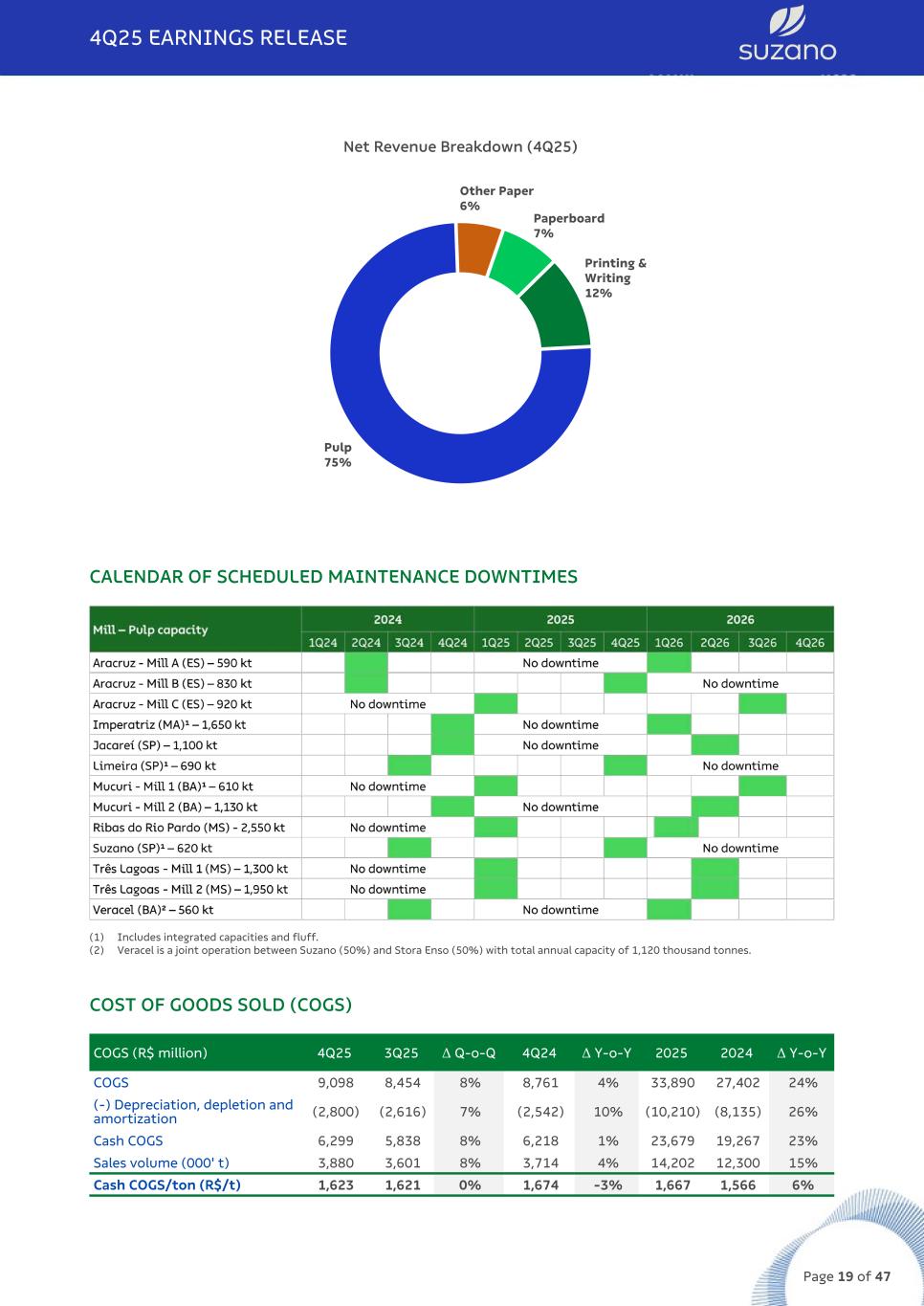 Net Revenue Breakdown (4Q25) Other Paper 6% Paperboard 7% Printing & Writing 12% Pulp 75% CALENDAR OF SCHEDULED MAINTENANCE DOWNTIMES (1) Includes integrated capacities and fluff. (2) Veracel is a joint operation between Suzano (50%) and Stora Enso (50%) with total annual capacity of 1,120 thousand tonnes. COST OF GOODS SOLD (COGS) COGS (R$ million) 4Q25 3Q25 Δ Q-o-Q 4Q24 Δ Y-o-Y 2025 2024 Δ Y-o-Y COGS 9,098 8,454 8% 8,761 4% 33,890 27,402 24% (-) Depreciation, depletion and amortization (2,800) (2,616) 7% (2,542) 10% (10,210) (8,135) 26% Cash COGS 6,299 5,838 8% 6,218 1% 23,679 19,267 23% Sales volume (000' t) 3,880 3,601 8% 3,714 4% 14,202 12,300 15% Cash COGS/ton (R$/t) 1,623 1,621 0% 1,674 -3% 1,667 1,566 6% 4Q25 EARNINGS RELEASE Page 19 of 47