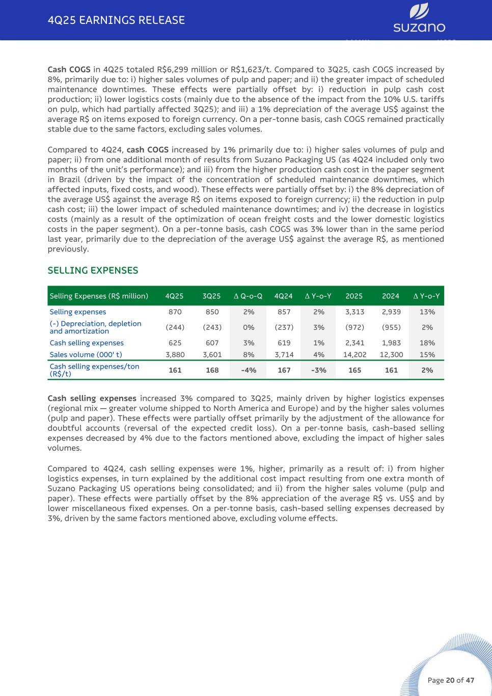 Cash COGS in 4Q25 totaled R$6,299 million or R$1,623/t. Compared to 3Q25, cash COGS increased by 8%, primarily due to: i) higher sales volumes of pulp and paper; and ii) the greater impact of scheduled maintenance downtimes. These effects were partially offset by: i) reduction in pulp cash cost production; ii) lower logistics costs (mainly due to the absence of the impact from the 10% U.S. tariffs on pulp, which had partially affected 3Q25); and iii) a 1% depreciation of the average US$ against the average R$ on items exposed to foreign currency. On a per-tonne basis, cash COGS remained practically stable due to the same factors, excluding sales volumes. Compared to 4Q24, cash COGS increased by 1% primarily due to: i) higher sales volumes of pulp and paper; ii) from one additional month of results from Suzano Packaging US (as 4Q24 included only two months of the unit’s performance); and iii) from the higher production cash cost in the paper segment in Brazil (driven by the impact of the concentration of scheduled maintenance downtimes, which affected inputs, fixed costs, and wood). These effects were partially offset by: i) the 8% depreciation of the average US$ against the average R$ on items exposed to foreign currency; ii) the reduction in pulp cash cost; iii) the lower impact of scheduled maintenance downtimes; and iv) the decrease in logistics costs (mainly as a result of the optimization of ocean freight costs and the lower domestic logistics costs in the paper segment). On a per-tonne basis, cash COGS was 3% lower than in the same period last year, primarily due to the depreciation of the average US$ against the average R$, as mentioned previously. SELLING EXPENSES Selling Expenses (R$ million) 4Q25 3Q25 Δ Q-o-Q 4Q24 Δ Y-o-Y 2025 2024 Δ Y-o-Y Selling expenses 870 850 2% 857 2% 3,313 2,939 13% (-) Depreciation, depletion and amortization (244) (243) 0% (237) 3% (972) (955) 2% Cash selling expenses 625 607 3% 619 1% 2,341 1,983 18% Sales volume (000' t) 3,880 3,601 8% 3,714 4% 14,202 12,300 15% Cash selling expenses/ton (R$/t) 161 168 -4% 167 -3% 165 161 2% Cash selling expenses increased 3% compared to 3Q25, mainly driven by higher logistics expenses (regional mix — greater volume shipped to North America and Europe) and by the higher sales volumes (pulp and paper). These effects were partially offset primarily by the adjustment of the allowance for doubtful accounts (reversal of the expected credit loss). On a per-tonne basis, cash-based selling expenses decreased by 4% due to the factors mentioned above, excluding the impact of higher sales volumes. Compared to 4Q24, cash selling expenses were 1%, higher, primarily as a result of: i) from higher logistics expenses, in turn explained by the additional cost impact resulting from one extra month of Suzano Packaging US operations being consolidated; and ii) from the higher sales volume (pulp and paper). These effects were partially offset by the 8% appreciation of the average R$ vs. US$ and by lower miscellaneous fixed expenses. On a per-tonne basis, cash-based selling expenses decreased by 3%, driven by the same factors mentioned above, excluding volume effects. 4Q25 EARNINGS RELEASE Page 20 of 47