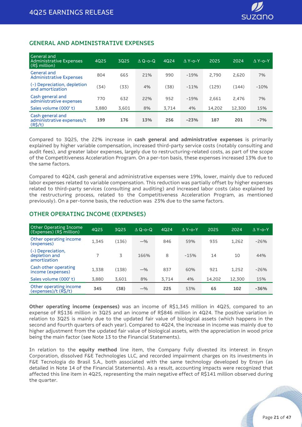 GENERAL AND ADMINISTRATIVE EXPENSES General and Administrative Expenses (R$ million) 4Q25 3Q25 Δ Q-o-Q 4Q24 Δ Y-o-Y 2025 2024 Δ Y-o-Y General and Administrative Expenses 804 665 21% 990 -19% 2,790 2,620 7% (-) Depreciation, depletion and amortization (34) (33) 4% (38) -11% (129) (144) -10% Cash general and administrative expenses 770 632 22% 952 -19% 2,661 2,476 7% Sales volume (000' t) 3,880 3,601 8% 3,714 4% 14,202 12,300 15% Cash general and administrative expenses/t (R$/t) 199 176 13% 256 -23% 187 201 -7% Compared to 3Q25, the 22% increase in cash general and administrative expenses is primarily explained by higher variable compensation, increased third-party service costs (notably consulting and audit fees), and greater labor expenses, largely due to restructuring-related costs, as part of the scope of the Competitiveness Acceleration Program. On a per-ton basis, these expenses increased 13% due to the same factors. Compared to 4Q24, cash general and administrative expenses were 19%, lower, mainly due to reduced labor expenses related to variable compensation. This reduction was partially offset by higher expenses related to third-party services (consulting and auditing) and increased labor costs (also explained by the restructuring process, related to the Competitiveness Acceleration Program, as mentioned previously). On a per-tonne basis, the reduction was 23% due to the same factors. OTHER OPERATING INCOME (EXPENSES) Other Operating Income (Expenses) (R$ million) 4Q25 3Q25 Δ Q-o-Q 4Q24 Δ Y-o-Y 2025 2024 Δ Y-o-Y Other operating income (expenses) 1,345 (136) —% 846 59% 935 1,262 -26% (-) Depreciation, depletion and amortization 7 3 166% 8 -15% 14 10 44% Cash other operating income (expenses) 1,338 (138) —% 837 60% 921 1,252 -26% Sales volume (000' t) 3,880 3,601 8% 3,714 4% 14,202 12,300 15% Other operating income (expenses)/t (R$/t) 345 (38) —% 225 53% 65 102 -36% Other operating income (expenses) was an income of R$1,345 million in 4Q25, compared to an expense of R$136 million in 3Q25 and an income of R$846 million in 4Q24. The positive variation in relation to 3Q25 is mainly due to the updated fair value of biological assets (which happens in the second and fourth quarters of each year). Compared to 4Q24, the increase in income was mainly due to higher adjustment from the updated fair value of biological assets, with the appreciation in wood price being the main factor (see Note 13 to the Financial Statements). In relation to the equity method line item, the Company fully divested its interest in Ensyn Corporation, dissolved F&E Technologies LLC, and recorded impairment charges on its investments in F&E Tecnologia do Brasil S.A., both associated with the same technology developed by Ensyn (as detailed in Note 14 of the Financial Statements). As a result, accounting impacts were recognized that affected this line item in 4Q25, representing the main negative effect of R$141 million observed during the quarter. 4Q25 EARNINGS RELEASE Page 21 of 47