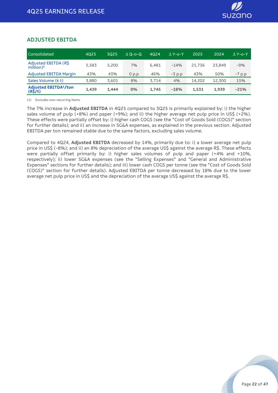 ADJUSTED EBITDA Consolidated 4Q25 3Q25 Δ Q-o-Q 4Q24 Δ Y-o-Y 2025 2024 Δ Y-o-Y Adjusted EBITDA (R$ million)¹ 5,583 5,200 7% 6,481 -14% 21,736 23,849 -9% Adjusted EBITDA Margin 43% 43% 0 p.p 46% -3 p.p 43% 50% -7 p.p Sales Volume (k t) 3,880 3,601 8% 3,714 4% 14,202 12,300 15% Adjusted EBITDA¹/ton (R$/t) 1,439 1,444 0% 1,745 -18% 1,531 1,939 -21% (1) Excludes non-recurring items. The 7% increase in Adjusted EBITDA in 4Q25 compared to 3Q25 is primarily explained by: i) the higher sales volume of pulp (+8%) and paper (+9%); and ii) the higher average net pulp price in US$ (+2%). These effects were partially offset by: i) higher cash COGS (see the "Cost of Goods Sold (COGS)" section for further details); and ii) an increase in SG&A expenses, as explained in the previous section. Adjusted EBITDA per ton remained stable due to the same factors, excluding sales volume. Compared to 4Q24, Adjusted EBITDA decreased by 14%, primarily due to: i) a lower average net pulp price in US$ (-8%); and ii) an 8% depreciation of the average US$ against the average R$. These effects were partially offset primarily by: i) higher sales volumes of pulp and paper (+4% and +10%, respectively); ii) lower SG&A expenses (see the "Selling Expenses" and "General and Administrative Expenses" sections for further details); and iii) lower cash COGS per tonne (see the "Cost of Goods Sold (COGS)" section for further details). Adjusted EBITDA per tonne decreased by 18% due to the lower average net pulp price in US$ and the depreciation of the average US$ against the average R$. 4Q25 EARNINGS RELEASE Page 22 of 47