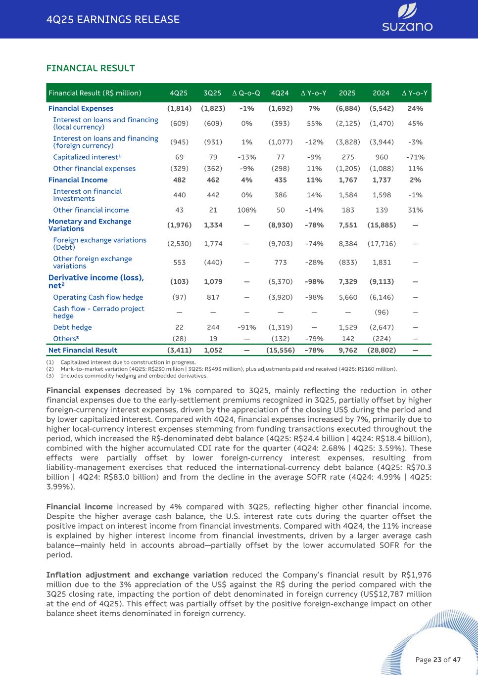 FINANCIAL RESULT Financial Result (R$ million) 4Q25 3Q25 Δ Q-o-Q 4Q24 Δ Y-o-Y 2025 2024 Δ Y-o-Y Financial Expenses (1,814) (1,823) -1% (1,692) 7% (6,884) (5,542) 24% Interest on loans and financing (local currency) (609) (609) 0% (393) 55% (2,125) (1,470) 45% Interest on loans and financing (foreign currency) (945) (931) 1% (1,077) -12% (3,828) (3,944) -3% Capitalized interest¹ 69 79 -13% 77 -9% 275 960 -71% Other financial expenses (329) (362) -9% (298) 11% (1,205) (1,088) 11% Financial Income 482 462 4% 435 11% 1,767 1,737 2% Interest on financial investments 440 442 0% 386 14% 1,584 1,598 -1% Other financial income 43 21 108% 50 -14% 183 139 31% Monetary and Exchange Variations (1,976) 1,334 — (8,930) -78% 7,551 (15,885) — Foreign exchange variations (Debt) (2,530) 1,774 — (9,703) -74% 8,384 (17,716) — Other foreign exchange variations 553 (440) — 773 -28% (833) 1,831 — Derivative income (loss), net2 (103) 1,079 — (5,370) -98% 7,329 (9,113) — Operating Cash flow hedge (97) 817 — (3,920) -98% 5,660 (6,146) — Cash flow - Cerrado project hedge — — — — — — (96) — Debt hedge 22 244 -91% (1,319) — 1,529 (2,647) — Others³ (28) 19 — (132) -79% 142 (224) — Net Financial Result (3,411) 1,052 — (15,556) -78% 9,762 (28,802) — (1) Capitalized interest due to construction in progress. (2) Mark-to-market variation (4Q25: R$230 million | 3Q25: R$493 million), plus adjustments paid and received (4Q25: R$160 million). (3) Includes commodity hedging and embedded derivatives. Financial expenses decreased by 1% compared to 3Q25, mainly reflecting the reduction in other financial expenses due to the early-settlement premiums recognized in 3Q25, partially offset by higher foreign-currency interest expenses, driven by the appreciation of the closing US$ during the period and by lower capitalized interest. Compared with 4Q24, financial expenses increased by 7%, primarily due to higher local-currency interest expenses stemming from funding transactions executed throughout the period, which increased the R$-denominated debt balance (4Q25: R$24.4 billion | 4Q24: R$18.4 billion), combined with the higher accumulated CDI rate for the quarter (4Q24: 2.68% | 4Q25: 3.59%). These effects were partially offset by lower foreign-currency interest expenses, resulting from liability-management exercises that reduced the international-currency debt balance (4Q25: R$70.3 billion | 4Q24: R$83.0 billion) and from the decline in the average SOFR rate (4Q24: 4.99% | 4Q25: 3.99%). Financial income increased by 4% compared with 3Q25, reflecting higher other financial income. Despite the higher average cash balance, the U.S. interest rate cuts during the quarter offset the positive impact on interest income from financial investments. Compared with 4Q24, the 11% increase is explained by higher interest income from financial investments, driven by a larger average cash balance—mainly held in accounts abroad—partially offset by the lower accumulated SOFR for the period. Inflation adjustment and exchange variation reduced the Company’s financial result by R$1,976 million due to the 3% appreciation of the US$ against the R$ during the period compared with the 3Q25 closing rate, impacting the portion of debt denominated in foreign currency (US$12,787 million at the end of 4Q25). This effect was partially offset by the positive foreign-exchange impact on other balance sheet items denominated in foreign currency. 4Q25 EARNINGS RELEASE Page 23 of 47
