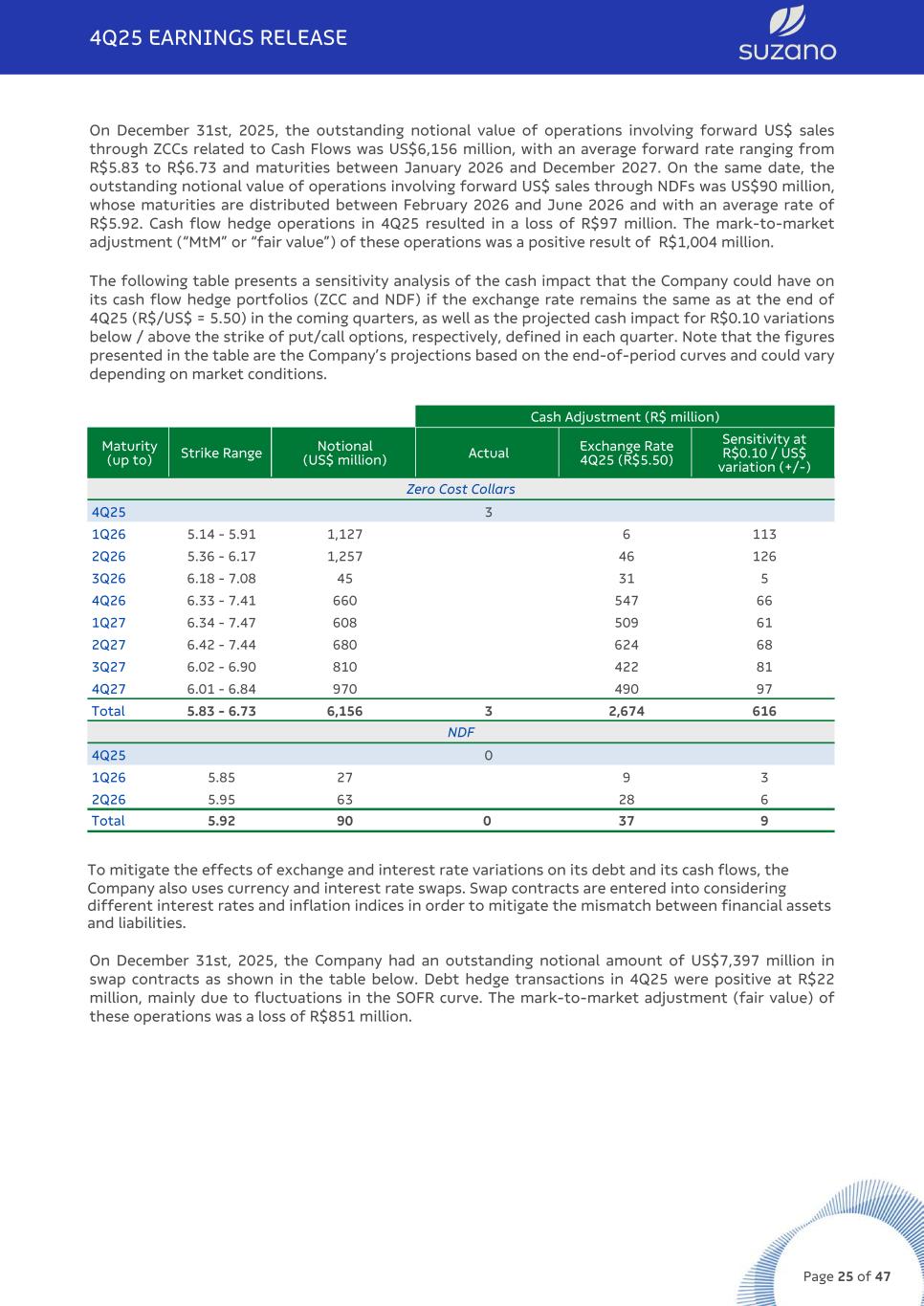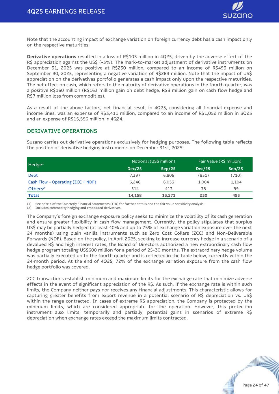 Note that the accounting impact of exchange variation on foreign currency debt has a cash impact only on the respective maturities. Derivative operations resulted in a loss of R$103 million in 4Q25, driven by the adverse effect of the R$ appreciation against the US$ (-3%). The mark-to-market adjustment of derivative instruments on December 31, 2025 was positive at R$230 million, compared to an income of R$493 million on September 30, 2025, representing a negative variation of R$263 million. Note that the impact of US$ appreciation on the derivatives portfolio generates a cash impact only upon the respective maturities. The net effect on cash, which refers to the maturity of derivative operations in the fourth quarter, was a positive R$160 million (R$163 million gain on debt hedge, R$3 million gain on cash flow hedge and R$7 million loss from commodities). As a result of the above factors, net financial result in 4Q25, considering all financial expense and income lines, was an expense of R$3,411 million, compared to an income of R$1,052 million in 3Q25 and an expense of R$15,556 million in 4Q24. DERIVATIVE OPERATIONS Suzano carries out derivative operations exclusively for hedging purposes. The following table reflects the position of derivative hedging instruments on December 31st, 2025: Hedge1 Notional (US$ million) Fair Value (R$ million) Dec/25 Sep/25 Dec/25 Sep/25 Debt 7,397 6,806 (851) (710) Cash Flow – Operating (ZCC + NDF) 6,246 6,053 1,004 1,104 Others2 514 413 78 99 Total 14,158 13,271 230 493 (1) See note 4 of the Quarterly Financial Statements (ITR) for further details and the fair value sensitivity analysis. (2) Includes commodity hedging and embedded derivatives. The Company’s foreign exchange exposure policy seeks to minimize the volatility of its cash generation and ensure greater flexibility in cash flow management. Currently, the policy stipulates that surplus US$ may be partially hedged (at least 40% and up to 75% of exchange variation exposure over the next 24 months) using plain vanilla instruments such as Zero Cost Collars (ZCC) and Non-Deliverable Forwards (NDF). Based on the policy, in April 2025, seeking to increase currency hedge in a scenario of a devalued R$ and high interest rates, the Board of Directors authorized a new extraordinary cash flow hedge program totaling US$600 million for a period of 25-30 months. The extraordinary hedge volume was partially executed up to the fourth quarter and is reflected in the table below, currently within the 24-month period. At the end of 4Q25, 72% of the exchange variation exposure from the cash flow hedge portfolio was covered. ZCC transactions establish minimum and maximum limits for the exchange rate that minimize adverse effects in the event of significant appreciation of the R$. As such, if the exchange rate is within such limits, the Company neither pays nor receives any financial adjustments. This characteristic allows for capturing greater benefits from export revenue in a potential scenario of R$ depreciation vs. US$ within the range contracted. In cases of extreme R$ appreciation, the Company is protected by the minimum limits, which are considered appropriate for the operation. However, this protection instrument also limits, temporarily and partially, potential gains in scenarios of extreme R$ depreciation when exchange rates exceed the maximum limits contracted. 4Q25 EARNINGS RELEASE Page 24 of 47